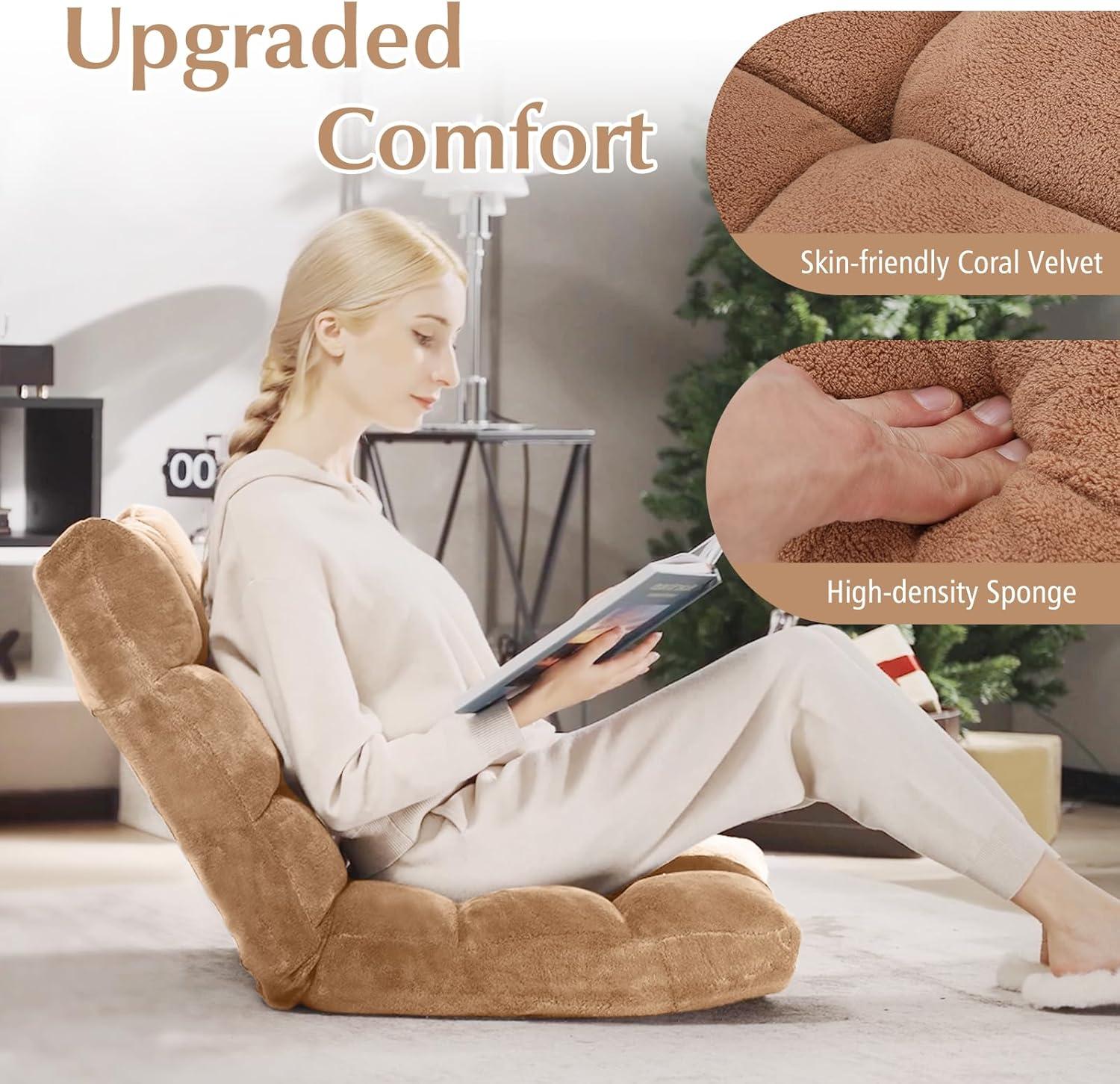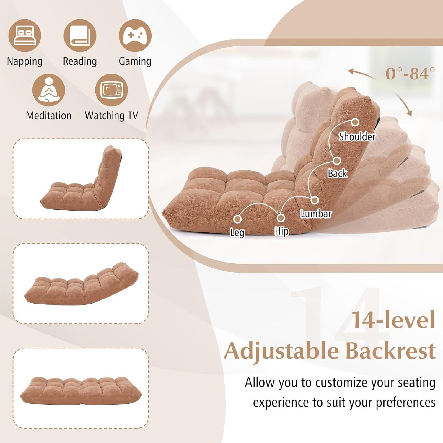 🎮[14 Adjustable Positions]: This foldable floor chair can provide you with 14 customizable positions from 0° to 84°, different angles backrest suit for personalized comfort and various needs, such as gaming, reading, watching movies, meditating, napping, sleeping, etc.