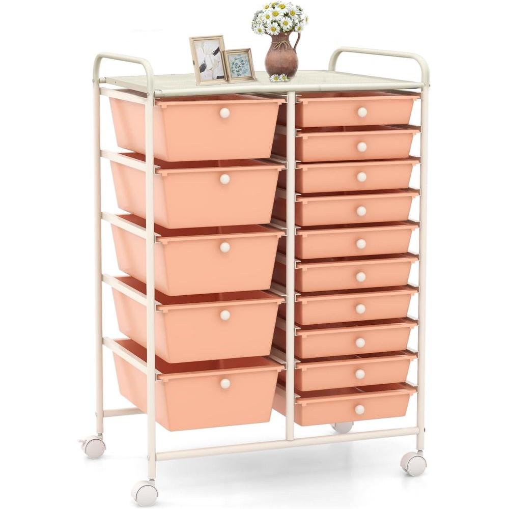 15 Drawers Rolling Storage Cart, Utility Tools Paper Organizer, Mobile Storage Organizer with Wheels, Art Cart Organizer for Kids, Craft Storage Cart for Office, School, Home (Clear)(Peach)