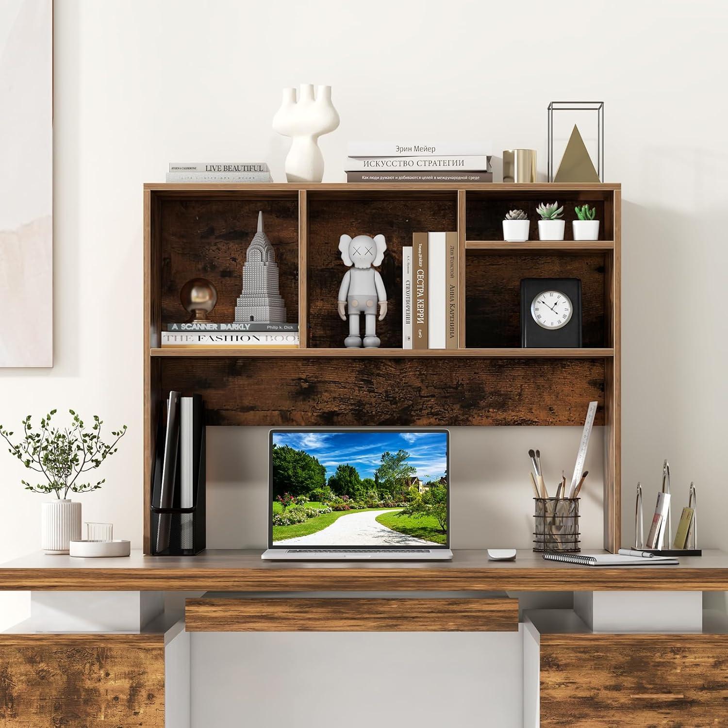 2-Tier Shelf, 37″ Wide College Hutch Top With 4 Shelves, Organizer for Computer Desk, Dorm, Home, Office, Study, Dining Table, Natural(Coffee)