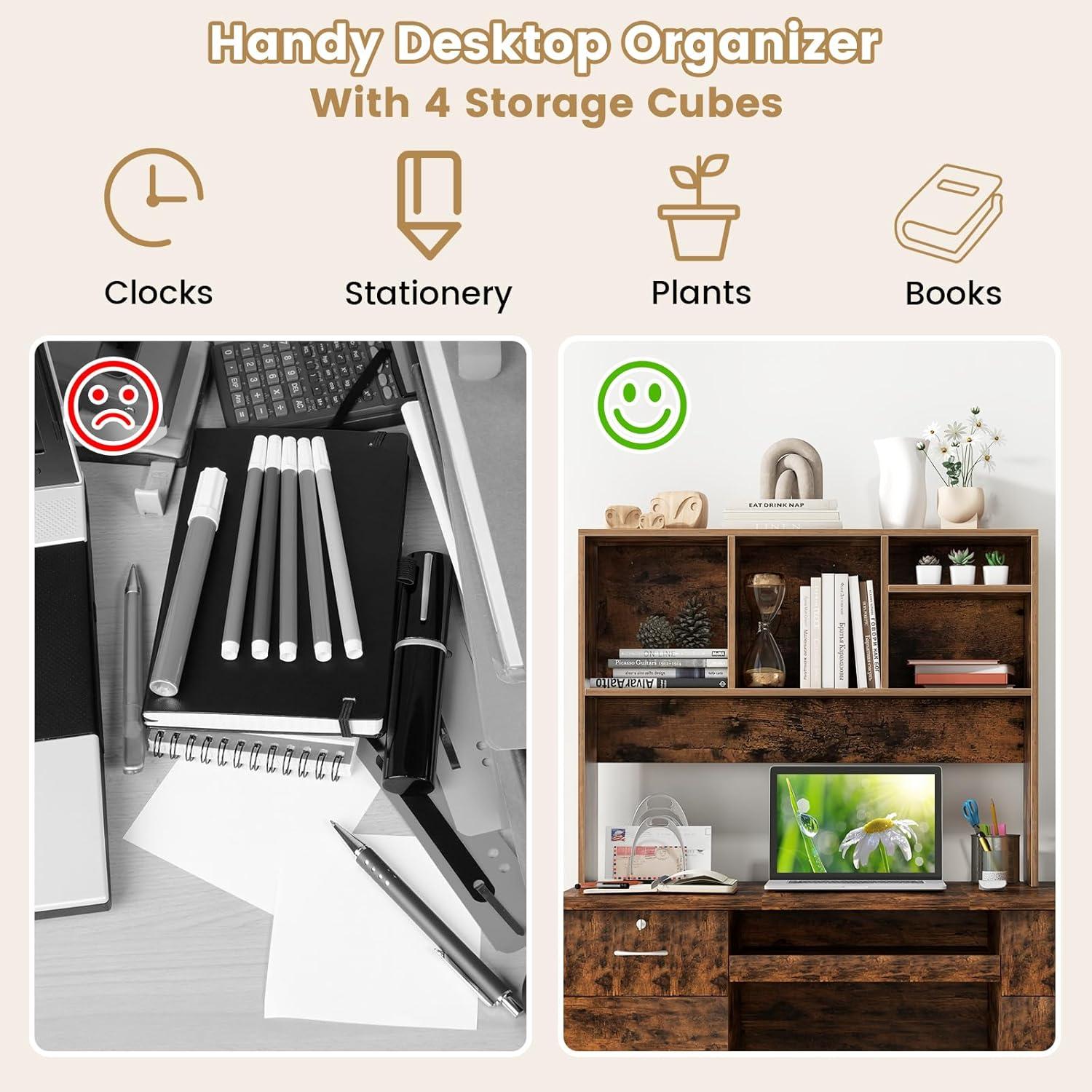 Spacious Storage: Designed with a 2-tier structure, this desktop bookshelf offers ample storage space. With four dedicated compartments and a large desktop surface, you can organize items by size and type, keeping your workspace tidy and efficient.