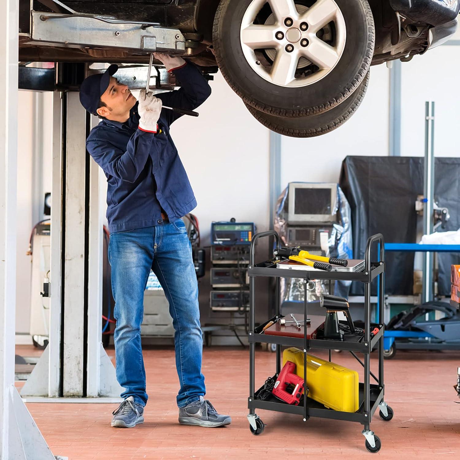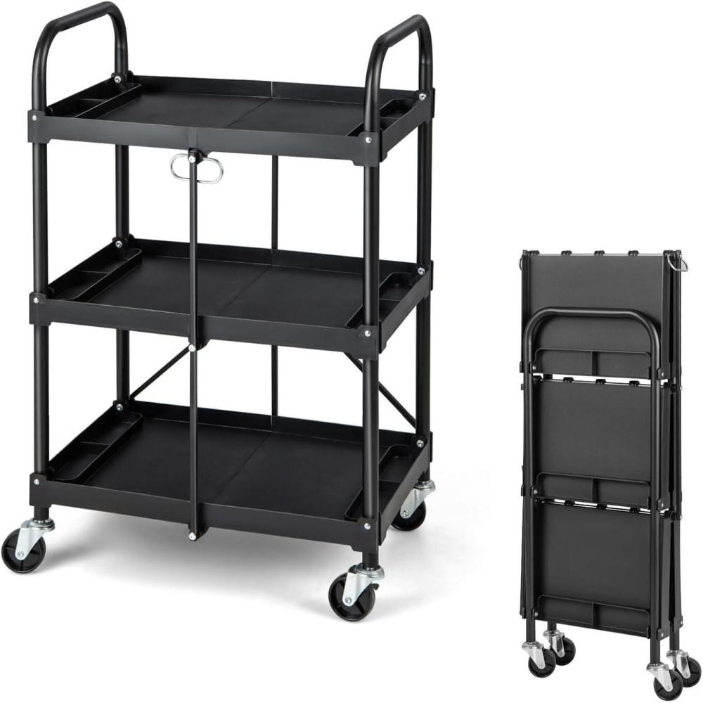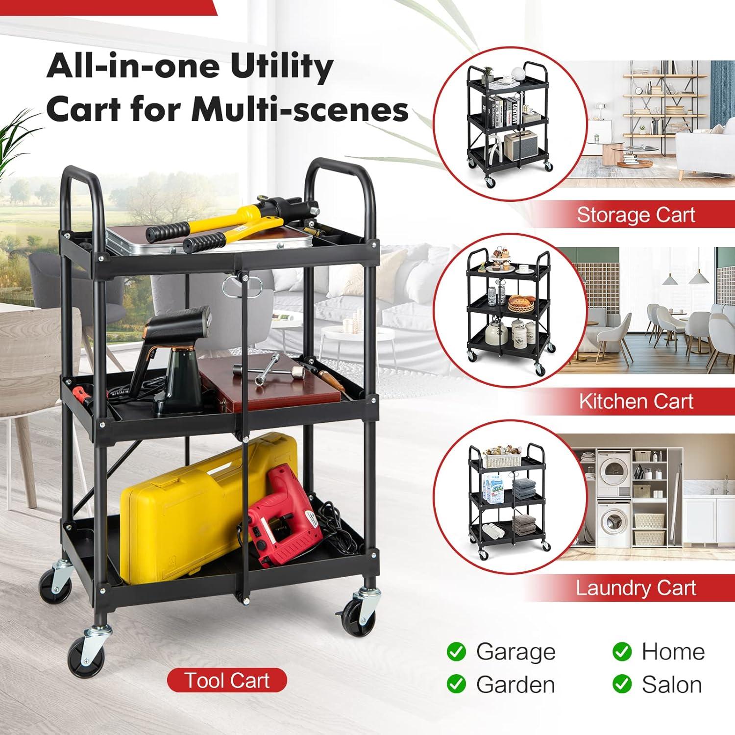 [Storage Space with Compartments]: Featuring 3 spacious shelves (24” x 17.5”), this folding tool cart provides sufficient space for different items storage. Besides, each tier includes 4 small open compartments (2 on each side), offering suitable place to organize tiny items like wrenches, screws, and scissors.
