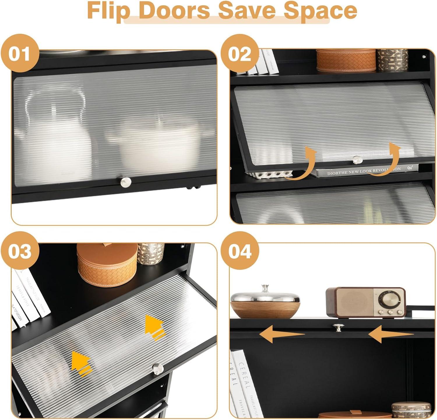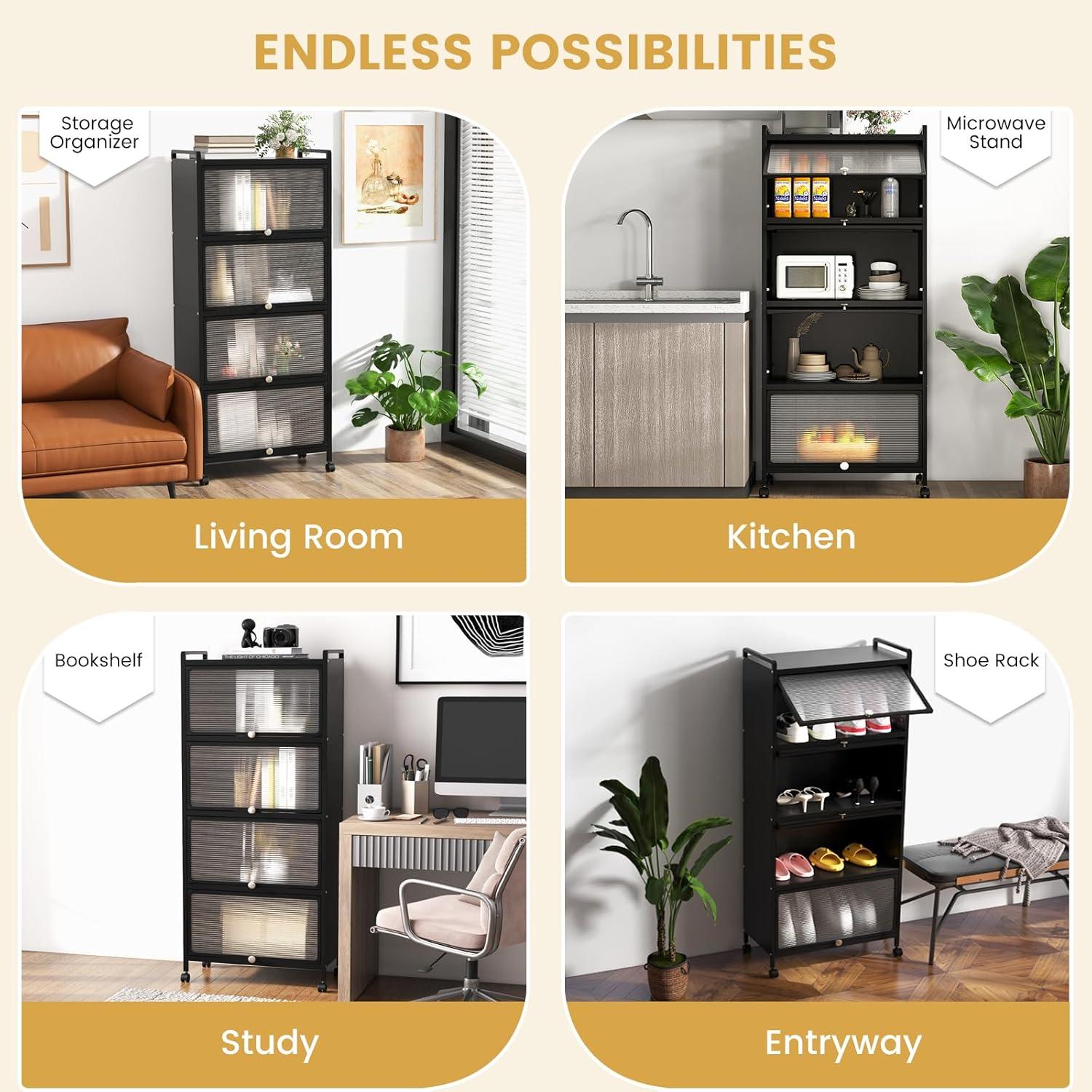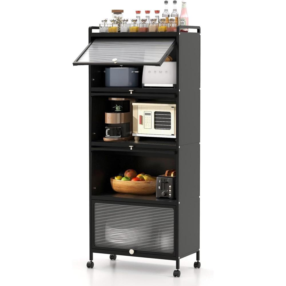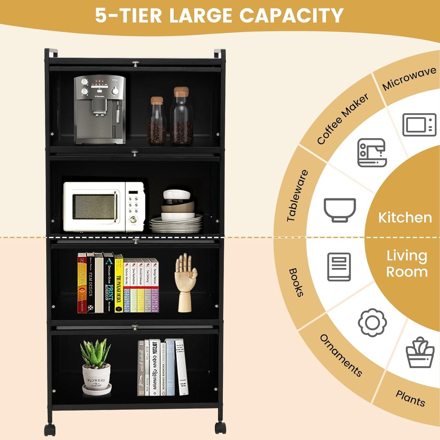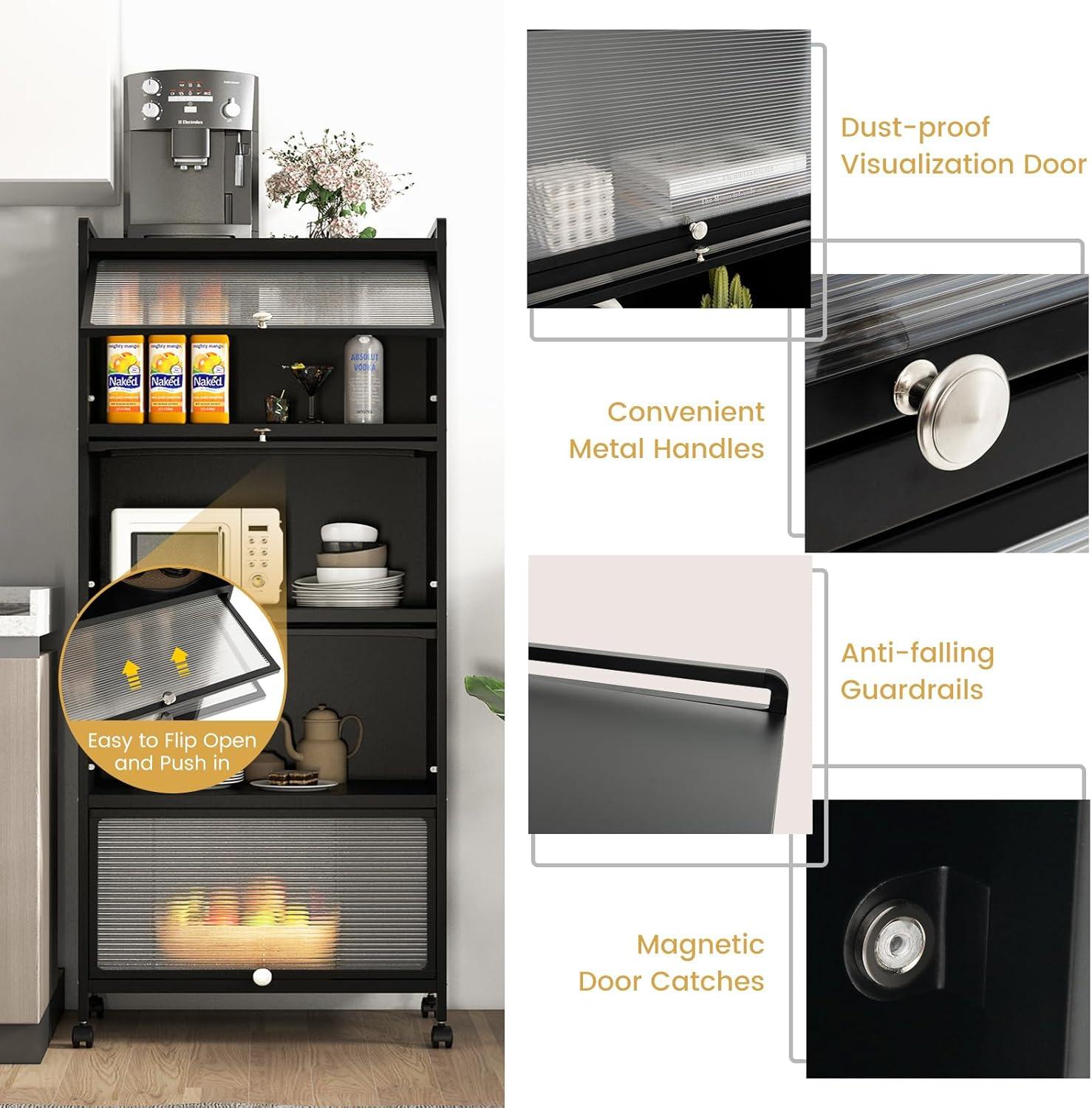 Elevate your kitchen with this versatile baker’s rack! This 5-tier microwave stand features semi-translucent flip-up doors for easy access to kitchen supplies, making it perfect for both storage and display. Crafted from sturdy metal and waterproof PC, it includes anti-toppling kits for safety and universal casters (2 lockable) for easy mobility. Its fashionable design, dust-proof doors, metal handles, and magnetic catches make it an ideal choice for any kitchen space.