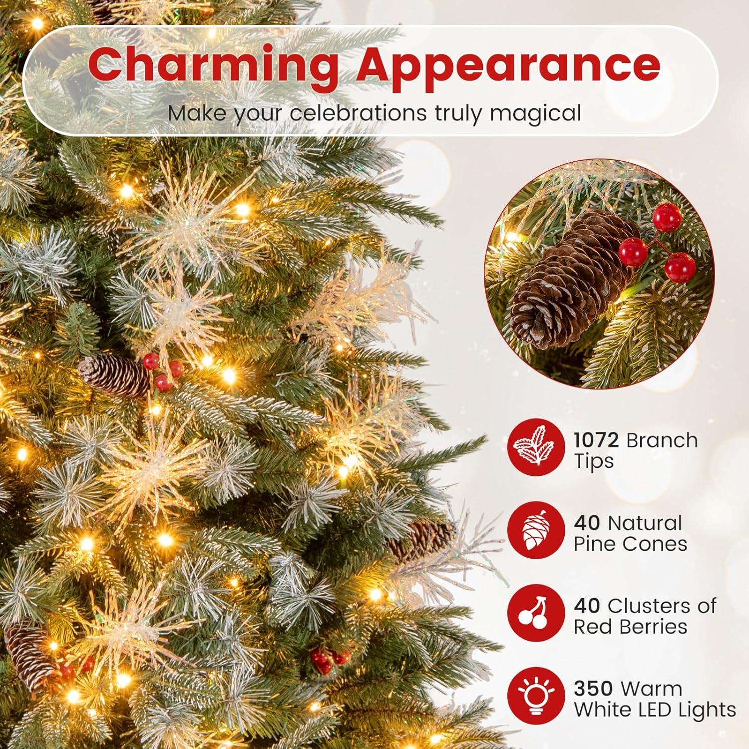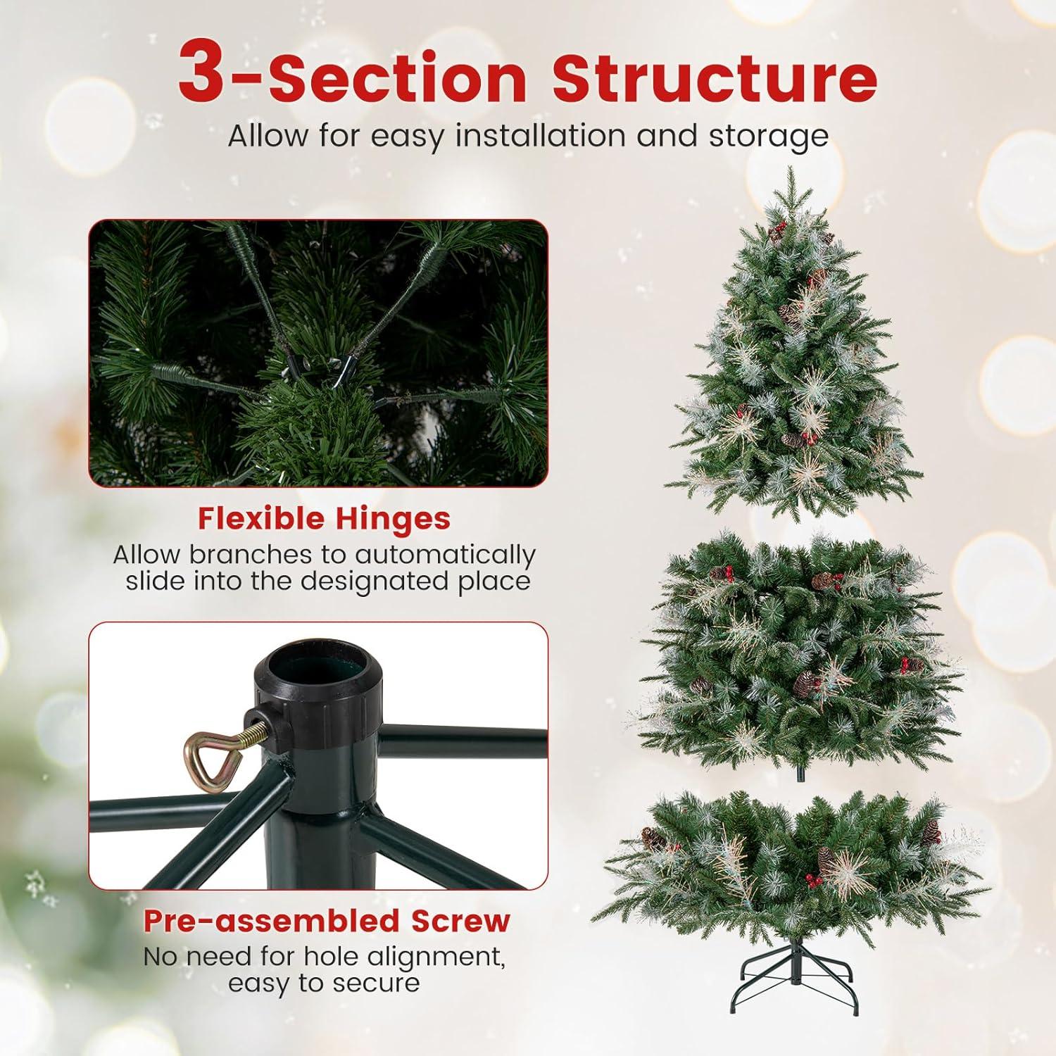 5FT Prelit Artificial Christmas Tree, Hinged Xmas Tree w/ 190 Warm White LED Lights, 8 Modes, 602 Branch Tips, 26 Pine Cones & 26 Clutters of Red Berries, Metal Stand, Easy Assembly (5FT)(7FT)