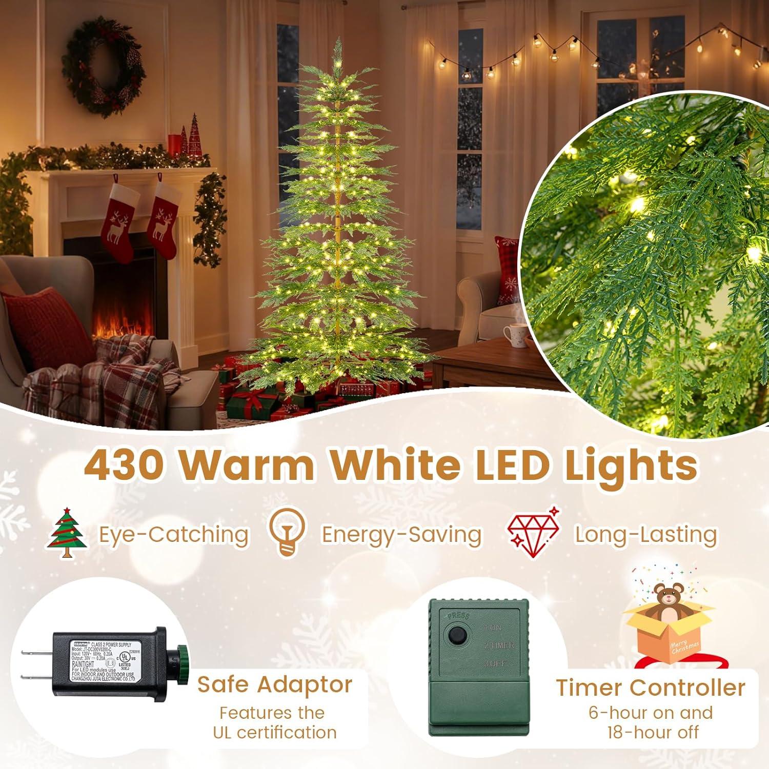 The artificial Christmas tree’s 470 or 612 PE branch tips create a lush, vivid look with gradient green colors that mimic real cypress leaves, adding an authentic touch to your festive setup. The pre-installed warm white LED lights cast a soft glow, turning the tree into a stunning focal point, and the auto timer takes the hassle out of managing the lights.