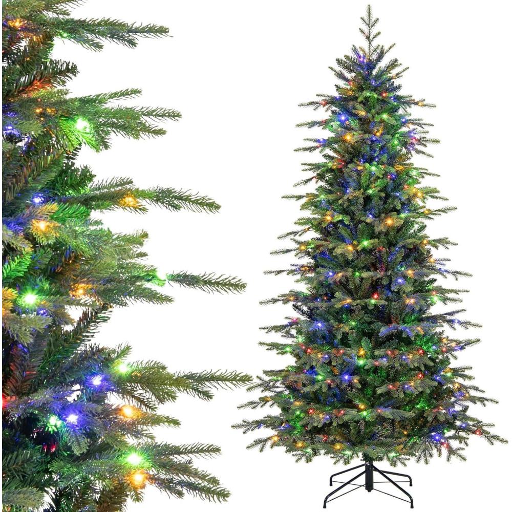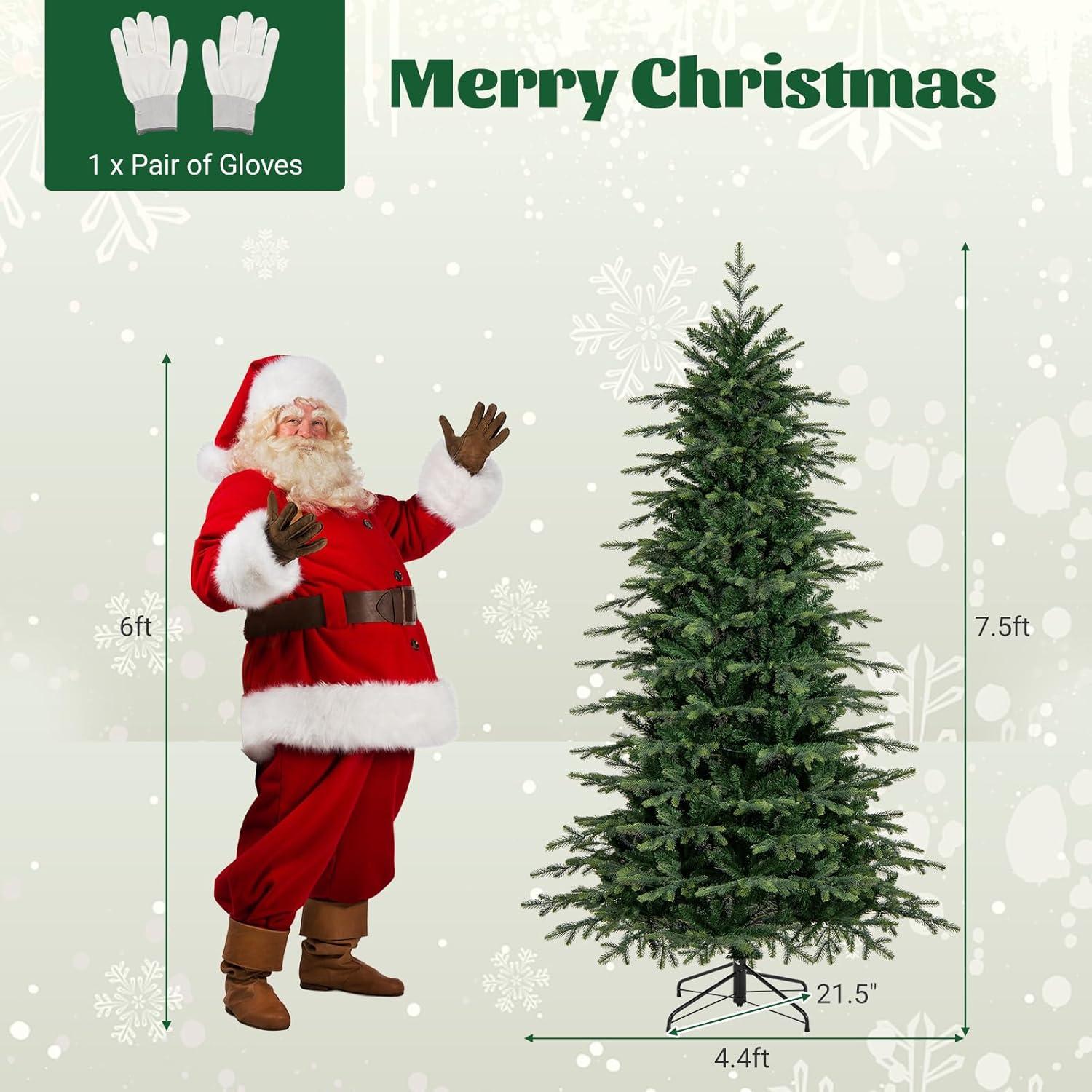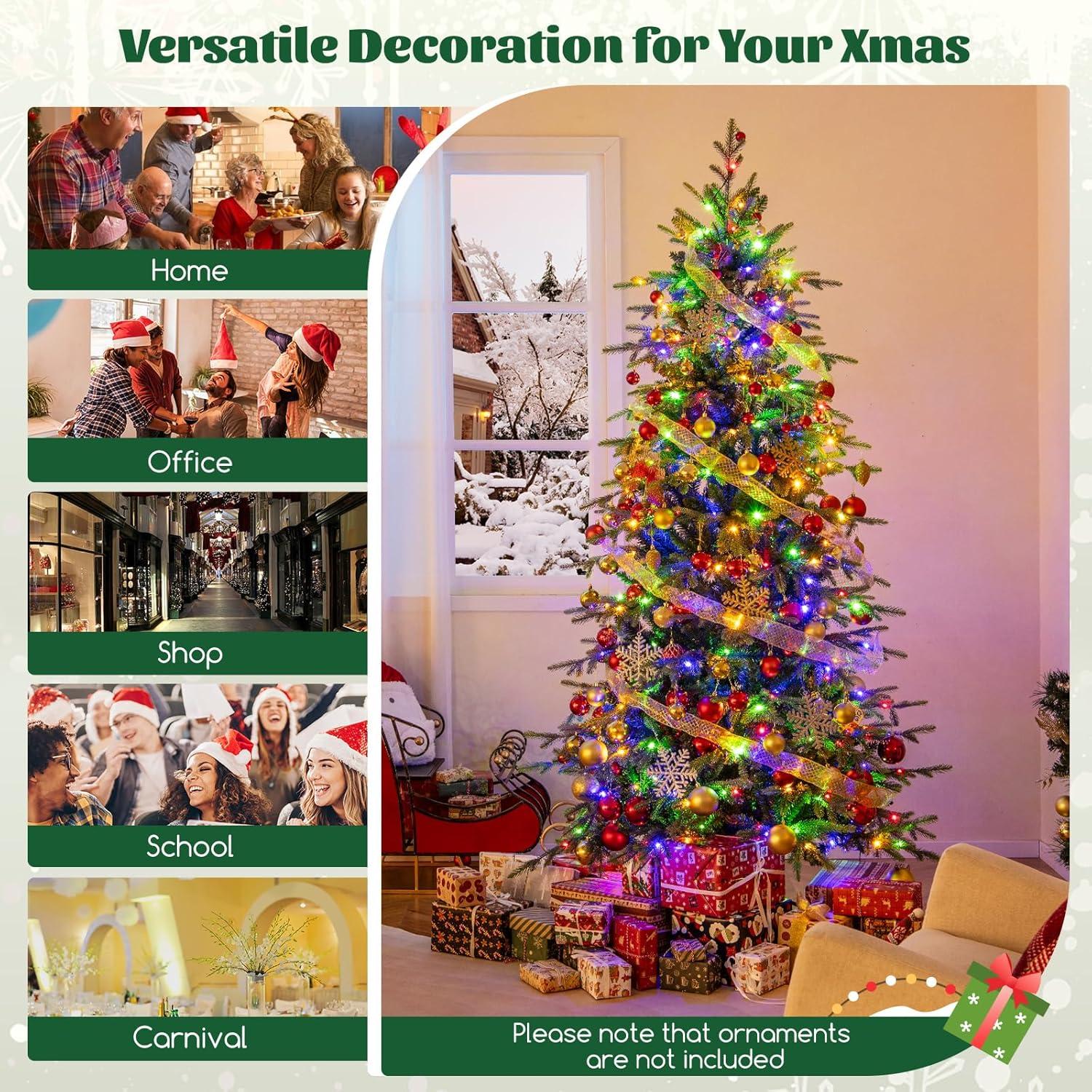 Elevate your holiday decoration with our versatile Pre-lit Artificial Christmas Tree, available in 6ft, 7.5ft and 9ft sizes to fit any space from small apartments to large living rooms. Each size features lush branch tips (714 to 1770) with a mix of PVC and PE leaves, delivering a realistic faux fir appearance that brings a festive vibe to your home, office or party. The green hinged Xmas tree is pre-installed with 260 to 560 color-changeable LED lights, supporting 11 lighting modes and 4 brightness levels to customize your holiday ambiance—switch between warm white and multicolored lights for different moods. Crafted from premium fire-resistant, fade-resistant and hypoallergenic materials, the premium Christmas tree ensures long-lasting use and safe enjoyment for the whole family. With a convenient hinged structure and 3-4 section design, assembly is a breeze, and the included gloves protect your hands during setup. The stable crossed metal base with anti-slip footpads prevents tipping and protects floors. Equipped with a remote control and timer function, this artificial Christmas tree offers hassle-free operation, making it the perfect holiday decoration for both seasonal and year-round use.