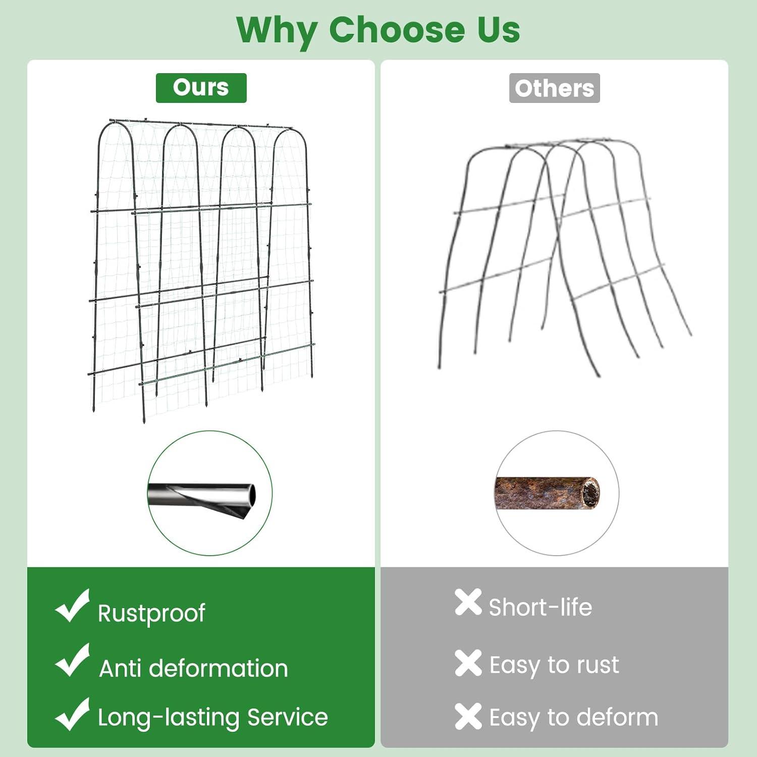 Reliable Material & Structure: Made of solid metal pipes with PE coating, this garden arched trellis is rust resistance and high temperature resistance for longevity. The sturdy trellis stakes can be deeply inserted into the ground for added stability