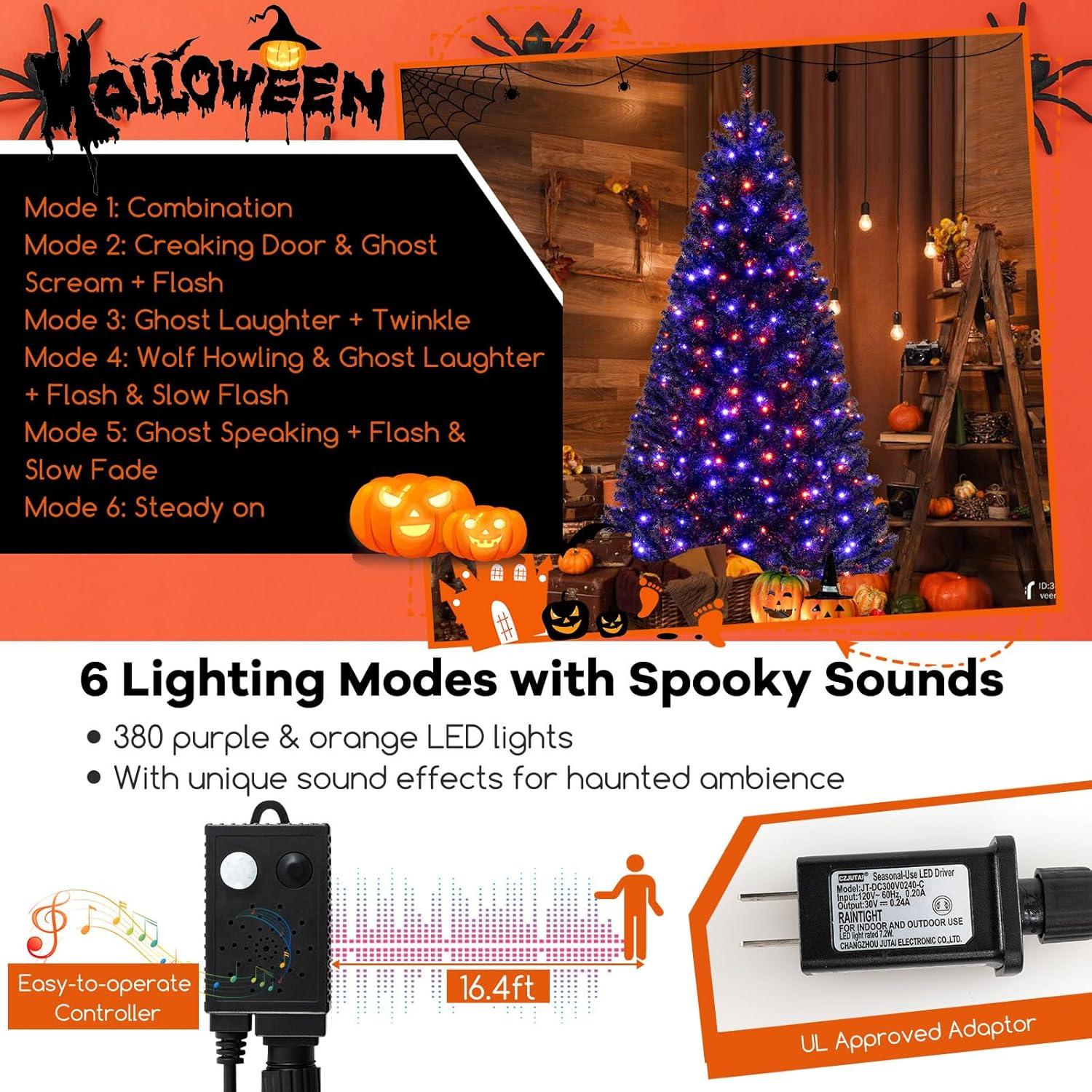 7FT Pre-Lit Black Christmas Tree, Artificial Xmas Tree w/Spooky Sounds, Folding Metal Stand, Hinged Halloween Tree w/ 380 Orange & Purple LED Lights, 6 Lighting Modes, 1040 Branch Tips(6ft)