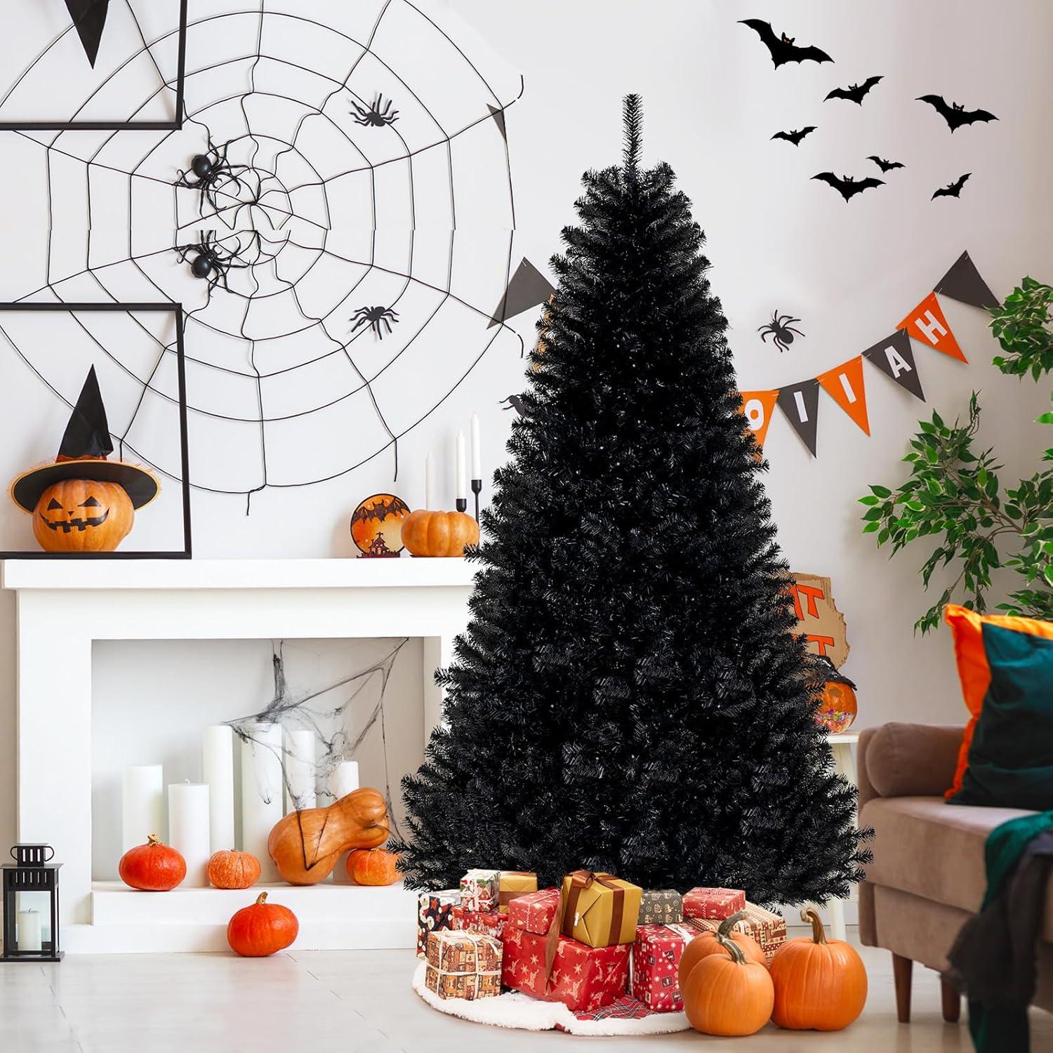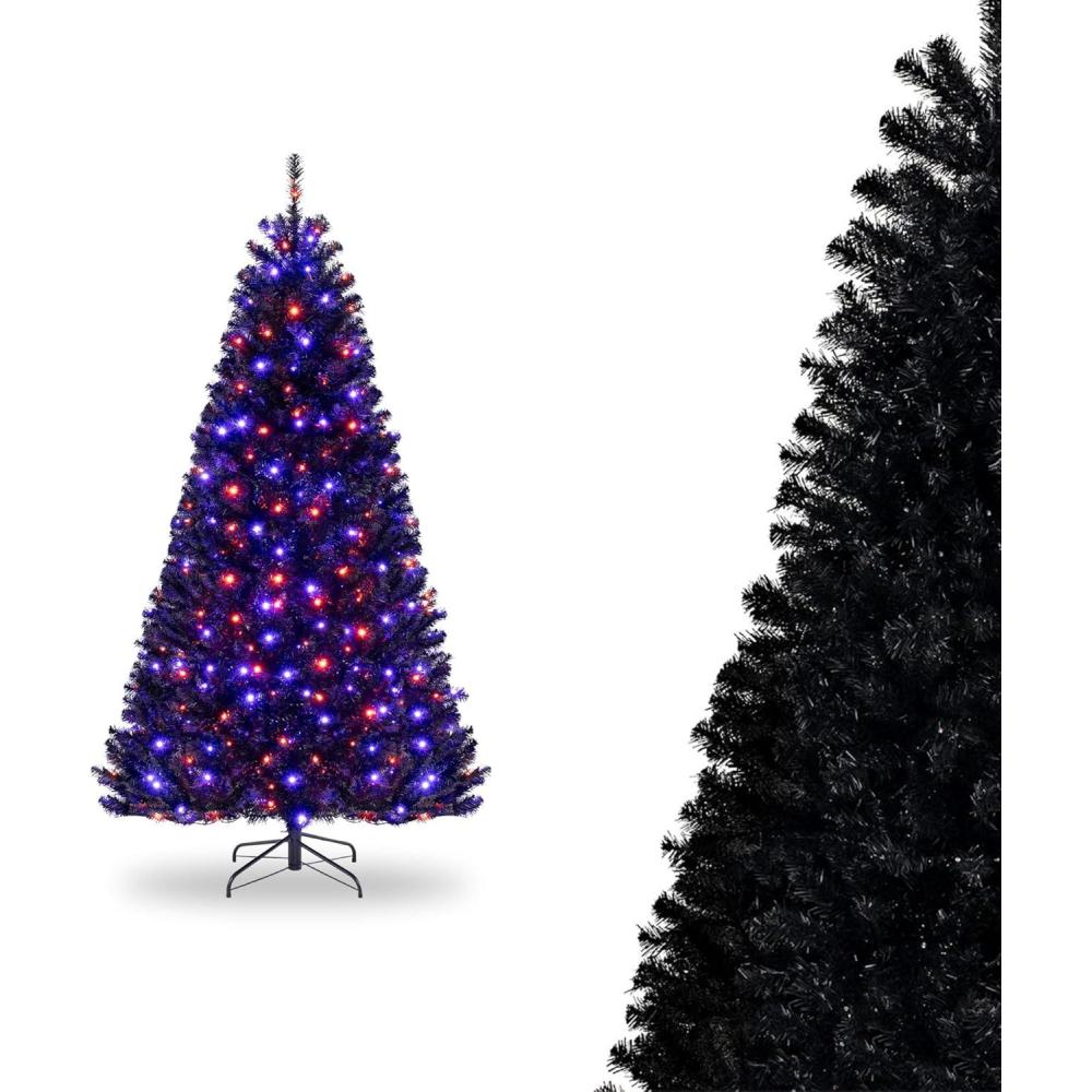 Striking Black Aesthetic: With 1040 lush branch tips and bold black foliage, this 6 ft black prelit christmas tree delivers a stunning, modern look. Enhanced by 380 vibrant orange and purple LED lights, it sets the perfect spooky tone for your Halloween decor