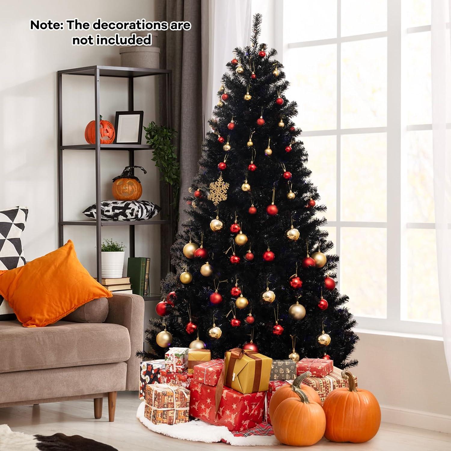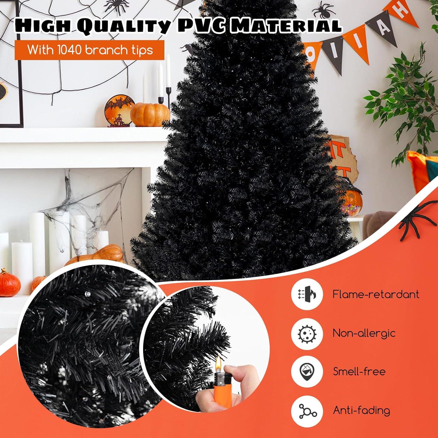 Quality Flame-Resistant Materials: Constructed from premium PVC, this black tree is both flame-resistant and odorless, providing a safe, long-lasting decoration. The robust metal base ensures the tree remains securely upright throughout the season