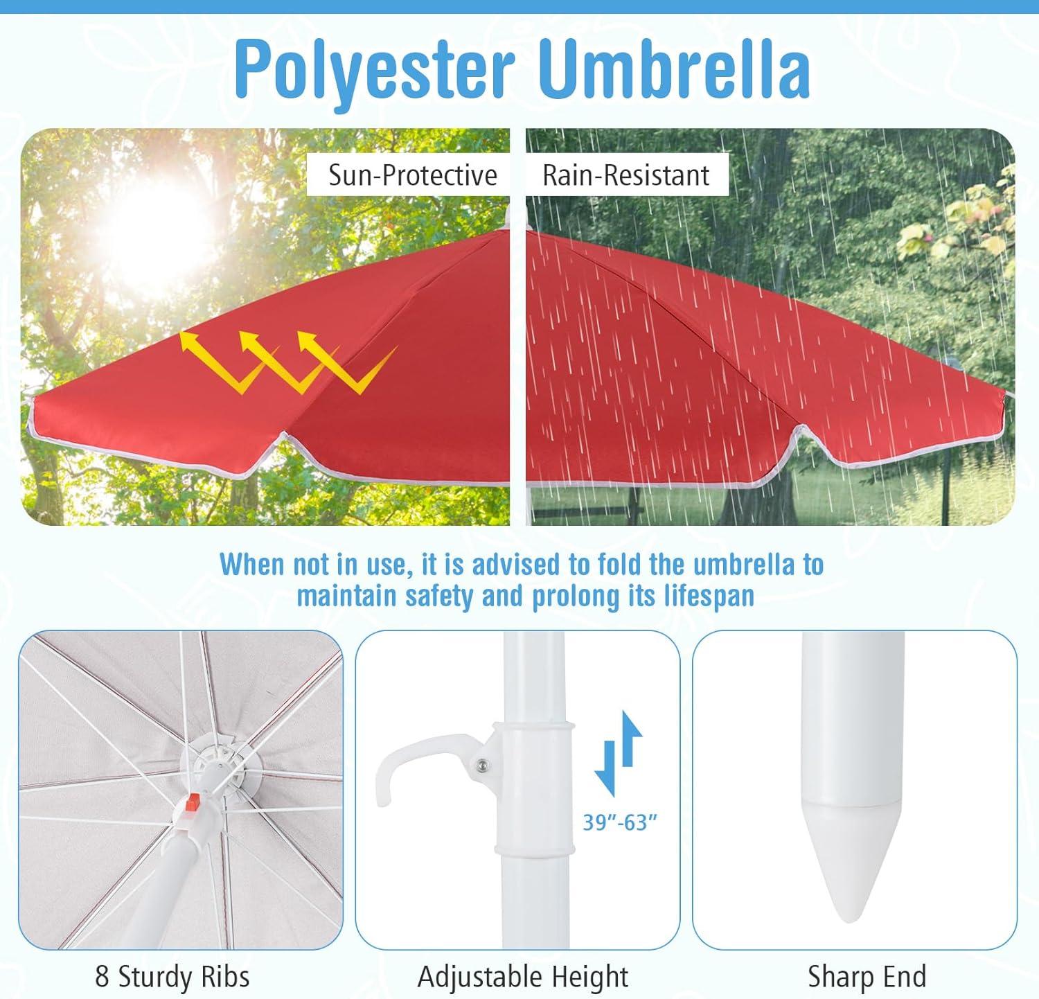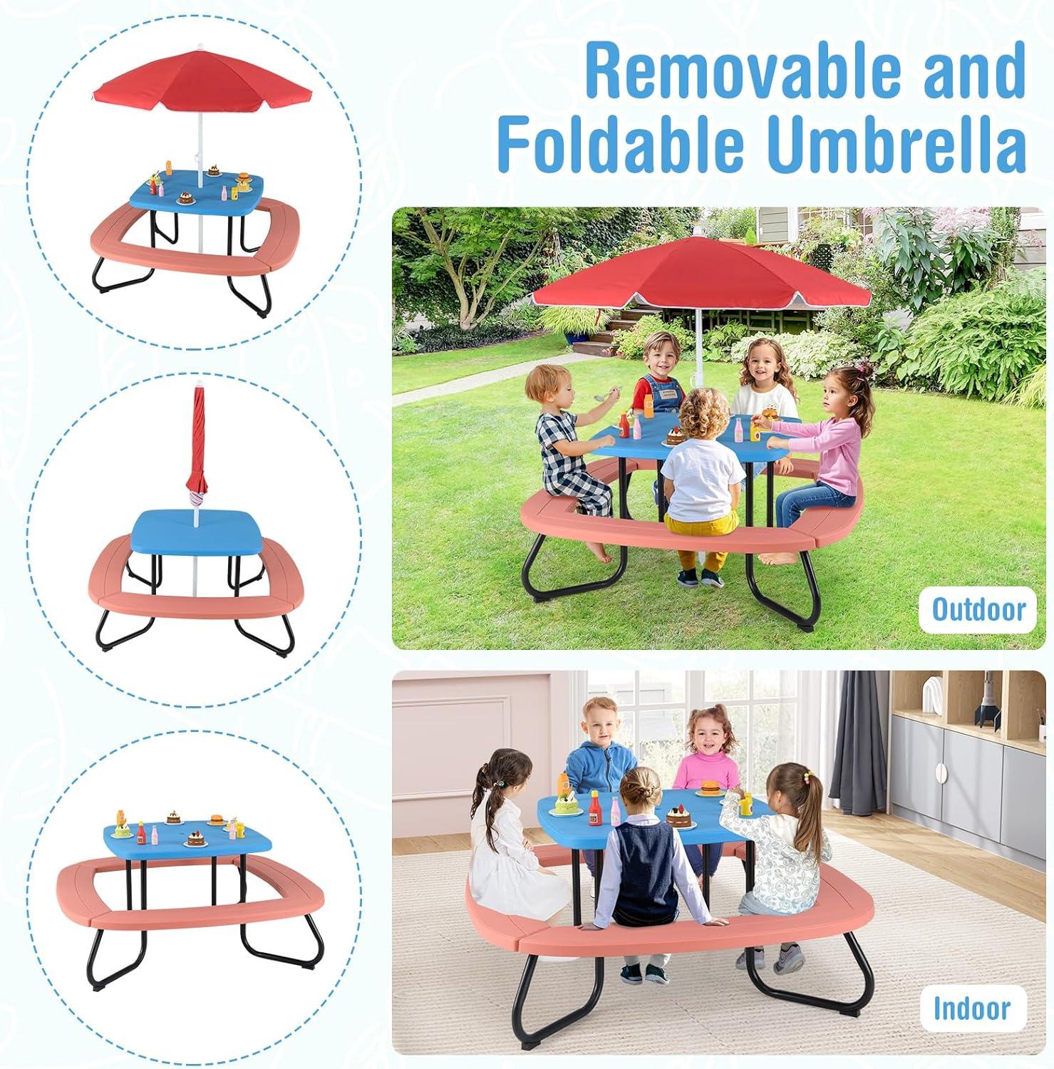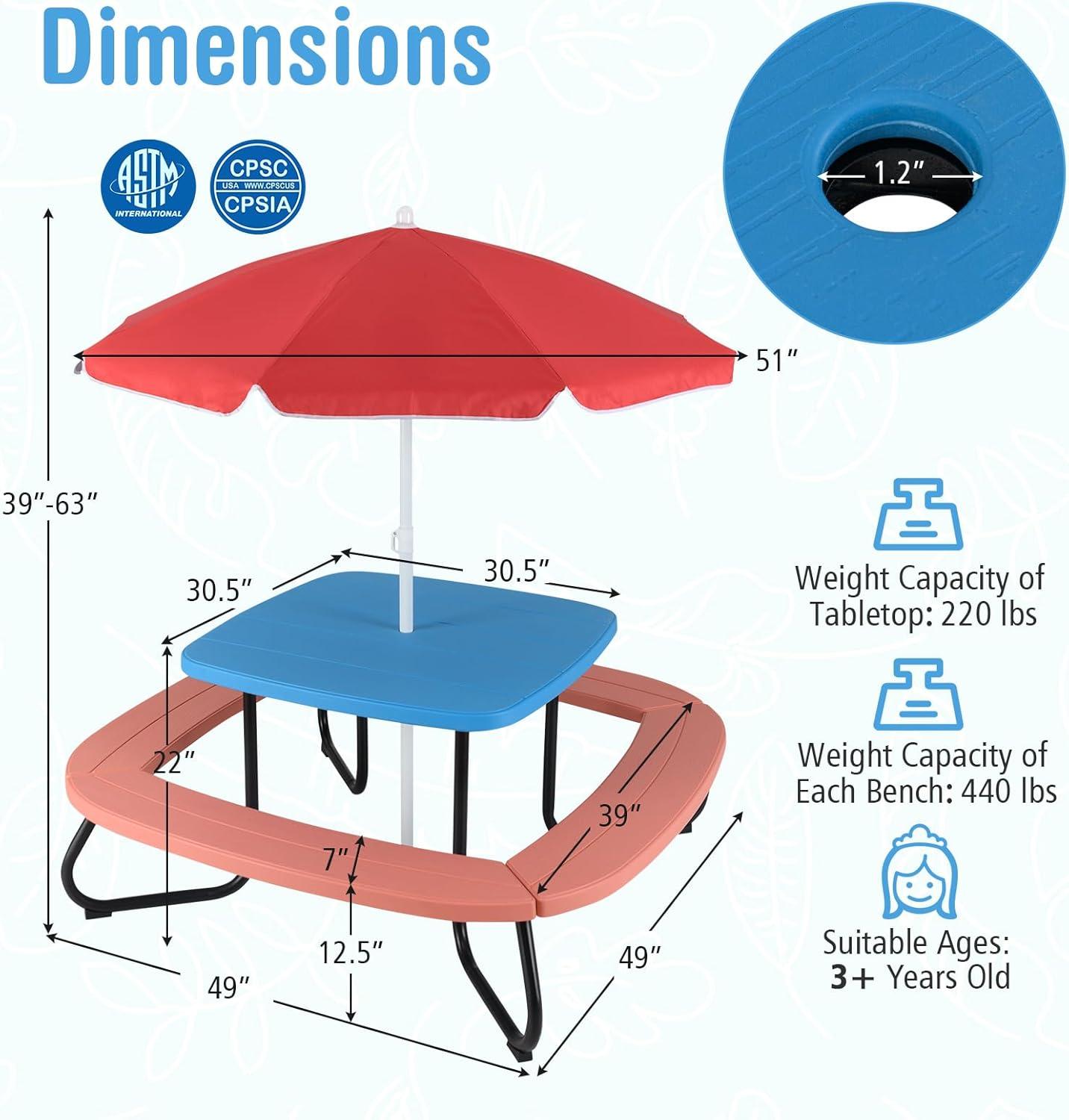 Crafted from premium HDPE material, this toddler picnic table is built to withstand outdoor conditions while prioritizing safety. The sturdy metal frame and non-slip foot pads ensure stability for peace of mind. With seating for up to 8 children on 4 benches, this table is perfect for group play. The polyester umbrella provides shade and can be easily folded away when not needed, offering adjustable height from 39” to 63” for added versatility. Suitable for various activities, this activity table is suitable for indoor and outdoor use, making it a great choice for children over 3 years old.