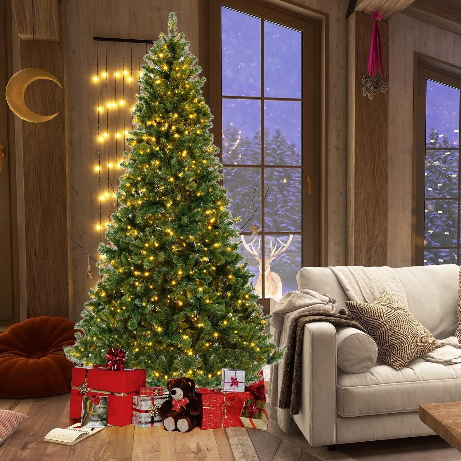 8ft Pre-Lit Christmas Tree, Artificial Hinged Xmas Tree with 880 LED Lights, Foldable Metal Stand & 2 Pairs of Gloves, Festival Decoration Tree for Home Living Room Office (8ft)(7ft 11in)