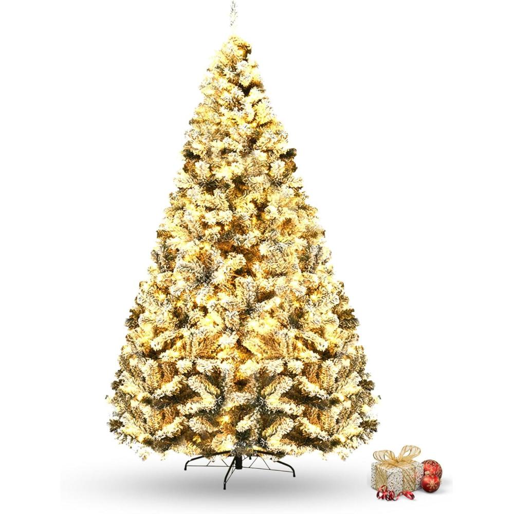 image9 FT PreLit Christmas Tree Easy to Assemble Snow Flocked Hinged Pine Tree Full Appearance Snowy Artificial Tree wLED Lights PVC Needles Prelighted Xmas Tree wSturdy Stand 9 FT7ft 6in