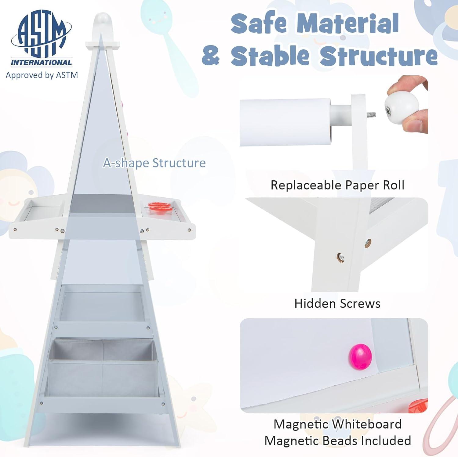 Art Easel for Kids, Wooden Standing Painting Easel w/White Board & Chalkboard, Paper Roll, Magnetic Beads, Pigment Cups, 2-Tier Rack with 2 Storage Bins, Double-Sided Toddler Easel (White)(White)