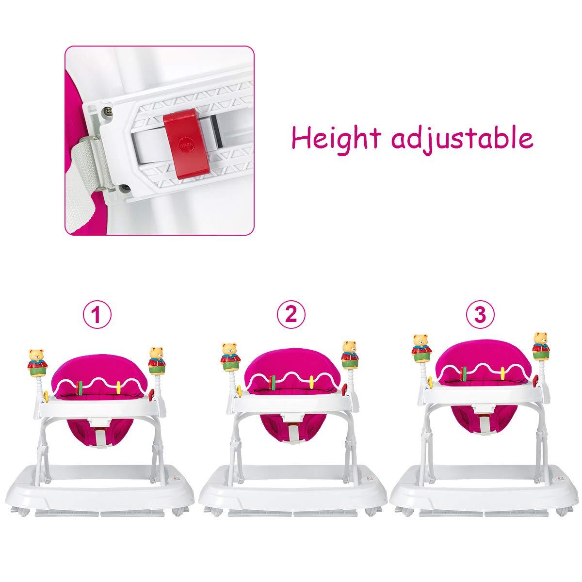 Baby Walker, Collapsible Baby Activity Walker with Walking Toys & 3-Levels Adjustable Height, Comfy High Back Seated Baby Walker with Wheels for Boys & Girls (Grey)(Pink)
