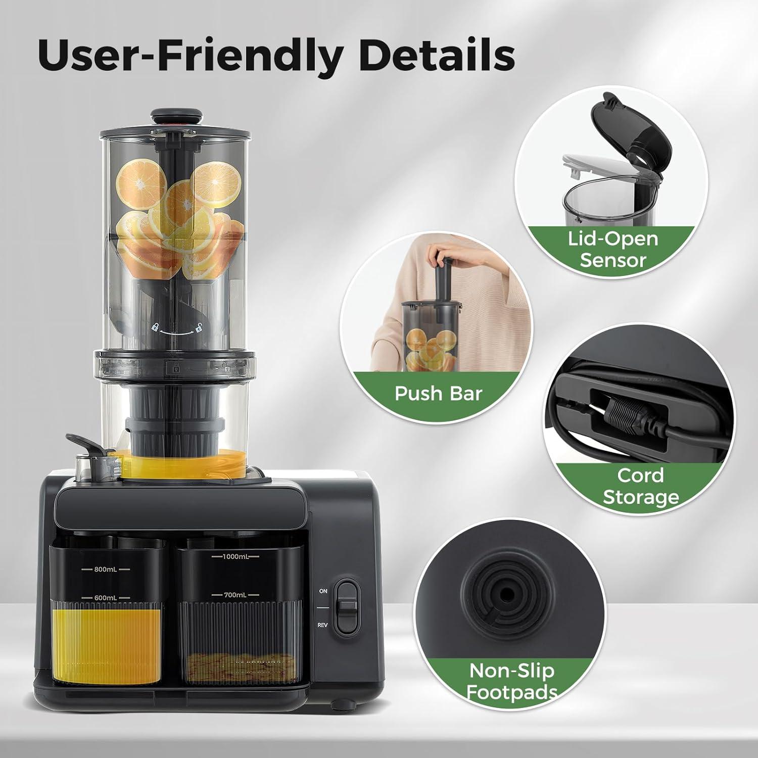 Experience the ultimate in juicing efficiency with this 20 NM cold press juicer designed to maximize juice yield while minimizing waste. The fruit juicer features advanced slow masticating technology operating at 43 RPM, providing a 7-stage extraction process for optimal nutrient retention. A 5.3″ extra-large feed chute accommodates whole fruits and vegetables, eliminating the need for pre-cutting and speeding up your juicing routine. One-touch control with anti-clogging ensures a smooth operation while a spill-proof juice spout offers convenience and cleanliness. The dual-layer filter minimizes sediment for smooth juice and the BPA-free construction ensures both safety and reliability. Easy to clean and dishwasher-safe, this juice extractor makes daily use effortless, allowing you to enjoy fresh and nutrient-rich juice with minimal hassle.