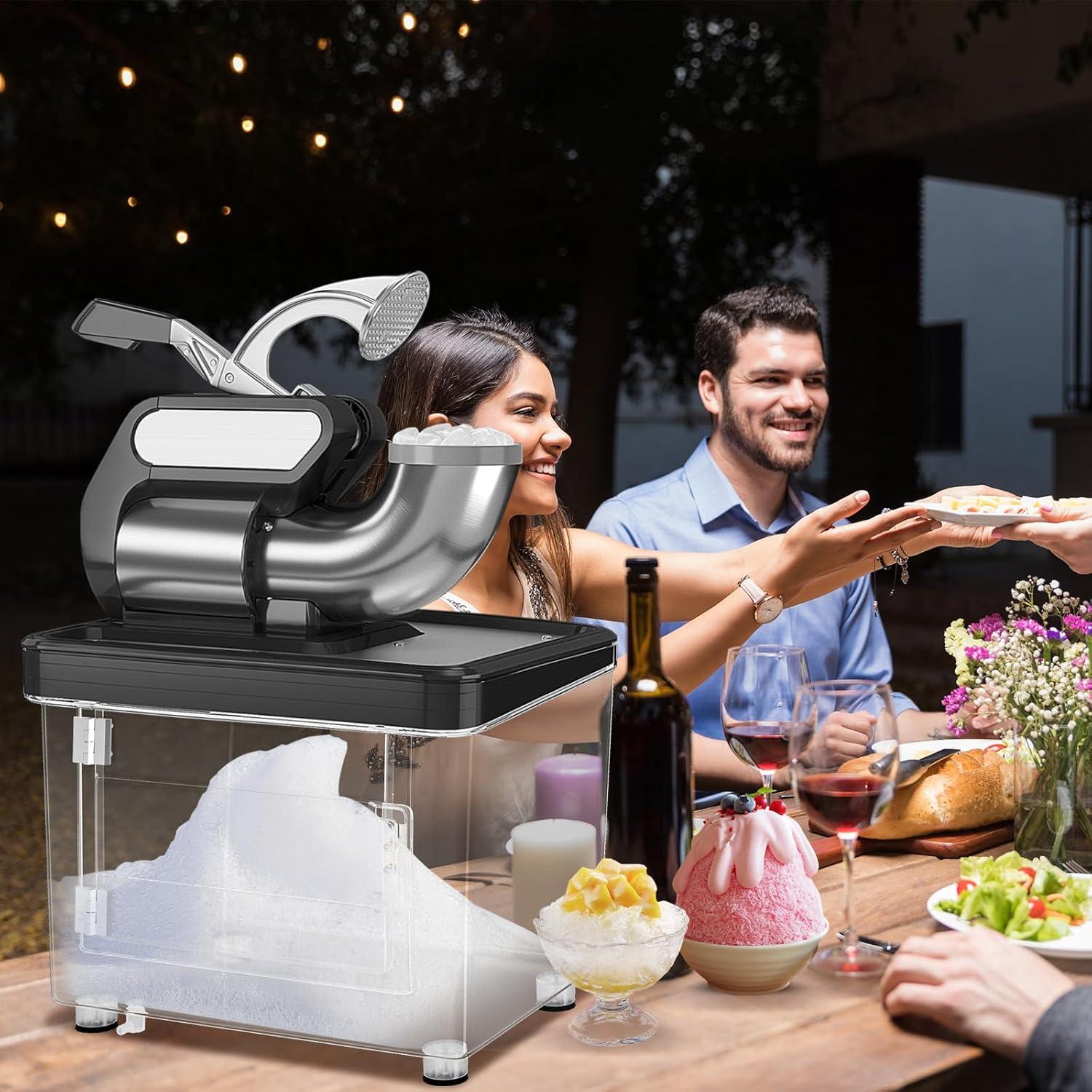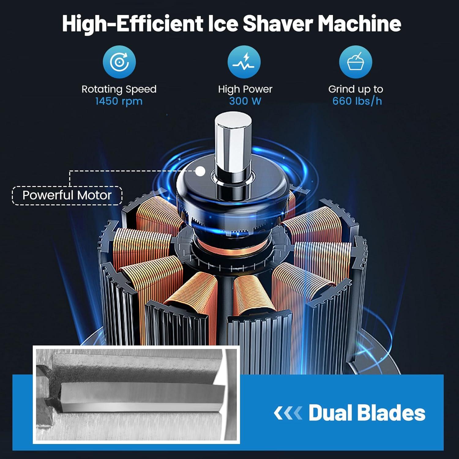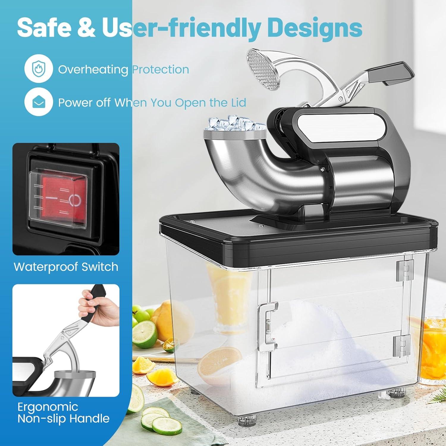 This beast of a machine has a powerful 300W motor and stainless steel dual blades that can crush up to 660 lbs of ice per hour. That’s a whole lot of cool! With an impressive speed of 1450 r/min, you’ll have perfectly fluffy ice in no time. The sturdy 7L ice box is made from reinforced PC material, keeping your shaved ice frozen for hours. And with ETL-approved safety features like a waterproof switch and overheat protection, you can enjoy your icy treats with peace of mind. Getting started is a breeze—just plug it in, add ice cubes, press the switch, lower the handle, and voilà! You’ve got icy goodness ready to go.