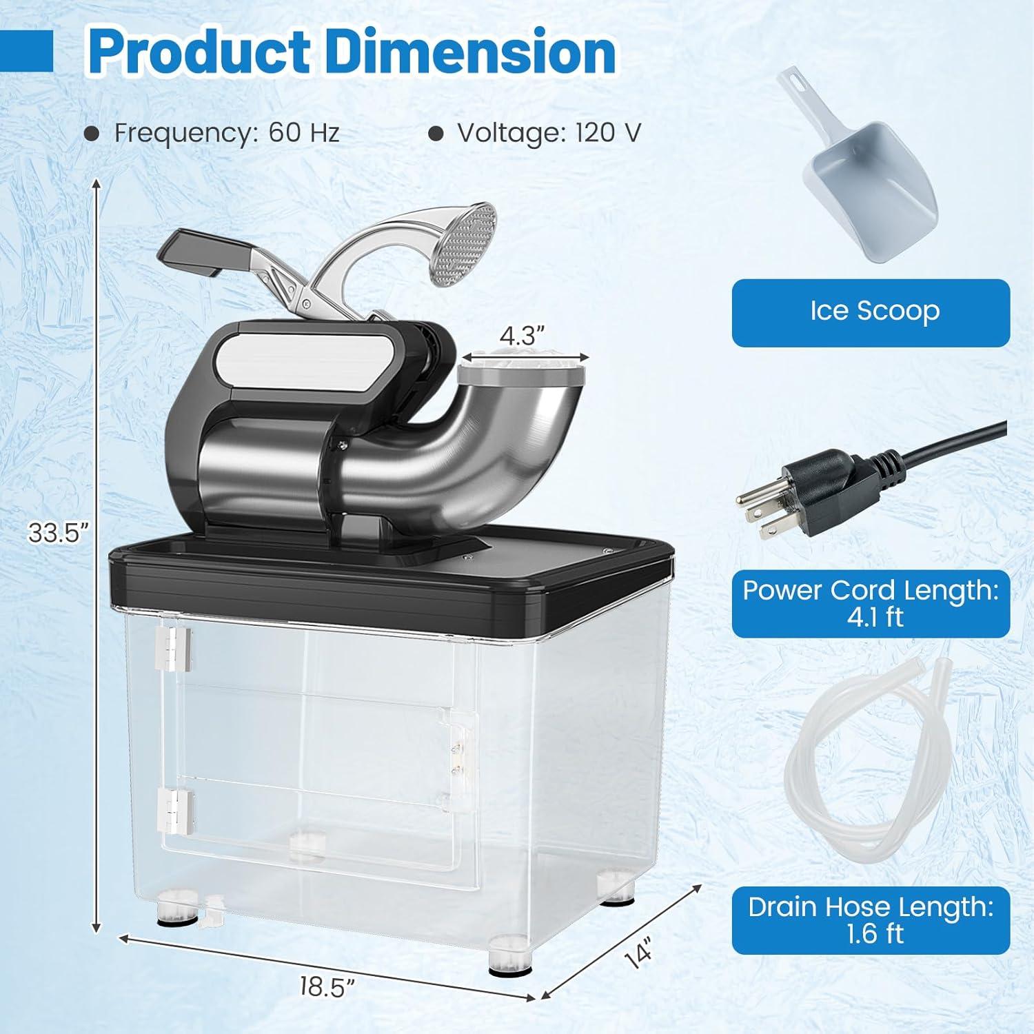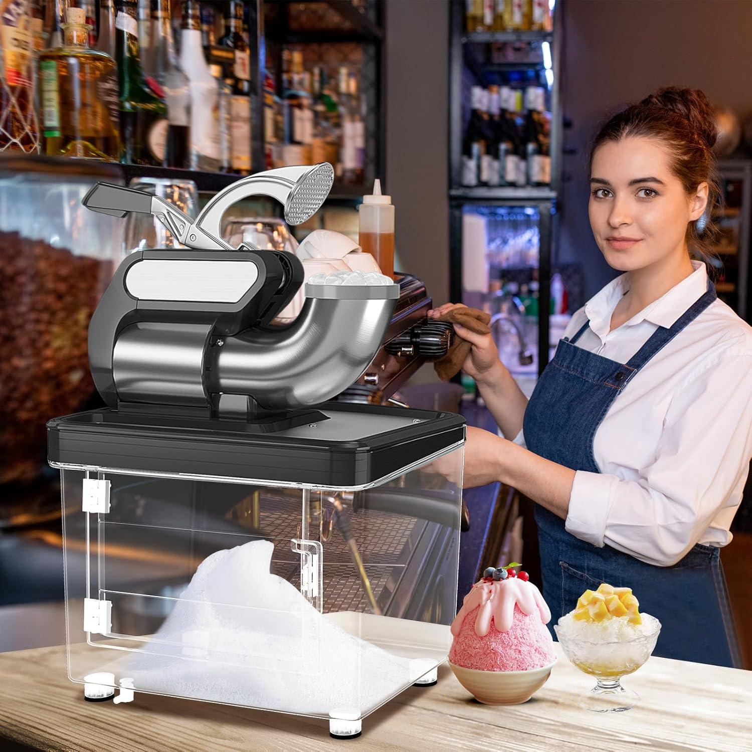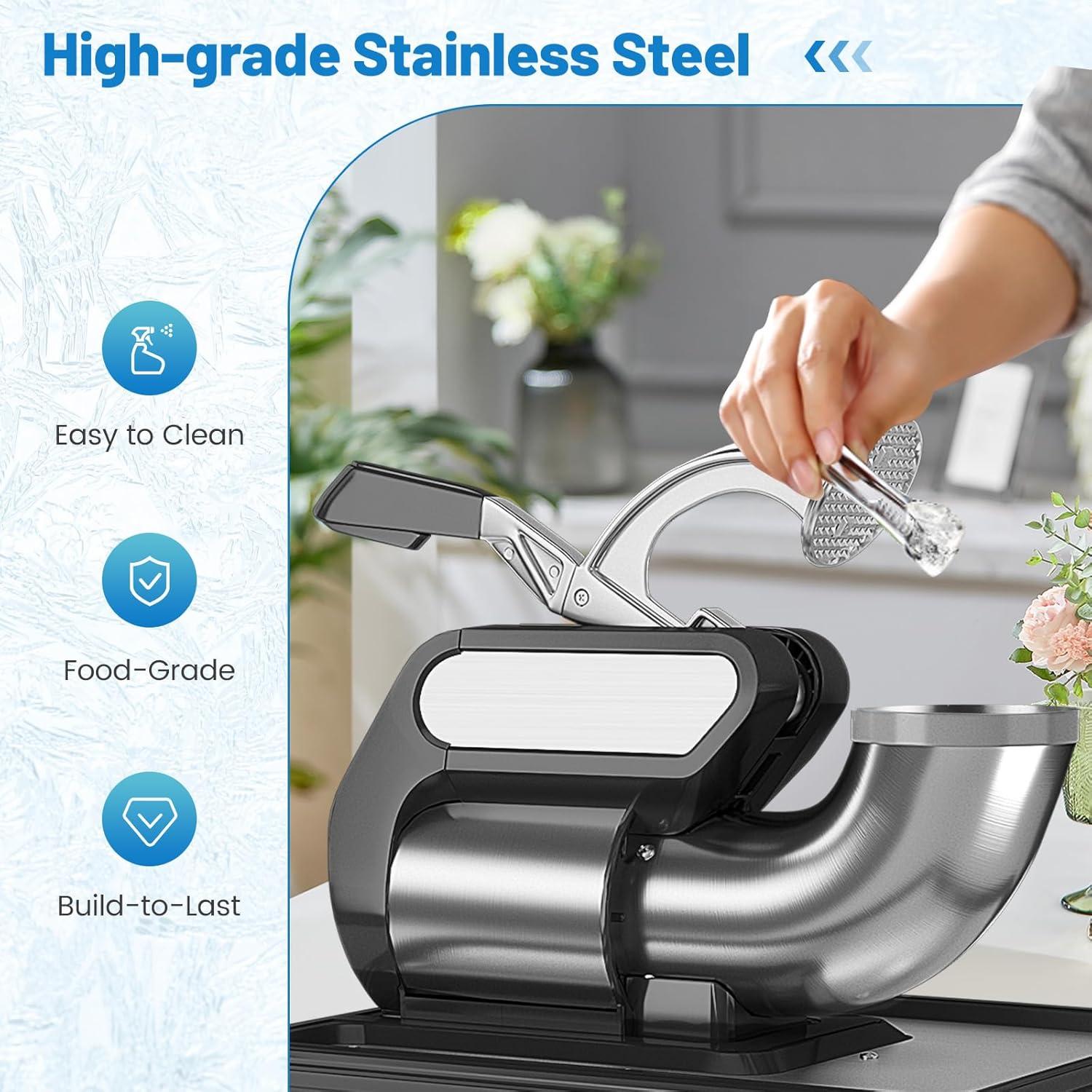 This beast of a machine has a powerful 300W motor and stainless steel dual blades that can crush up to 660 lbs of ice per hour. That’s a whole lot of cool! With an impressive speed of 1450 r/min, you’ll have perfectly fluffy ice in no time. The sturdy 7L ice box is made from reinforced PC material, keeping your shaved ice frozen for hours. And with ETL-approved safety features like a waterproof switch and overheat protection, you can enjoy your icy treats with peace of mind. Getting started is a breeze—just plug it in, add ice cubes, press the switch, lower the handle, and voilà! You’ve got icy goodness ready to go.