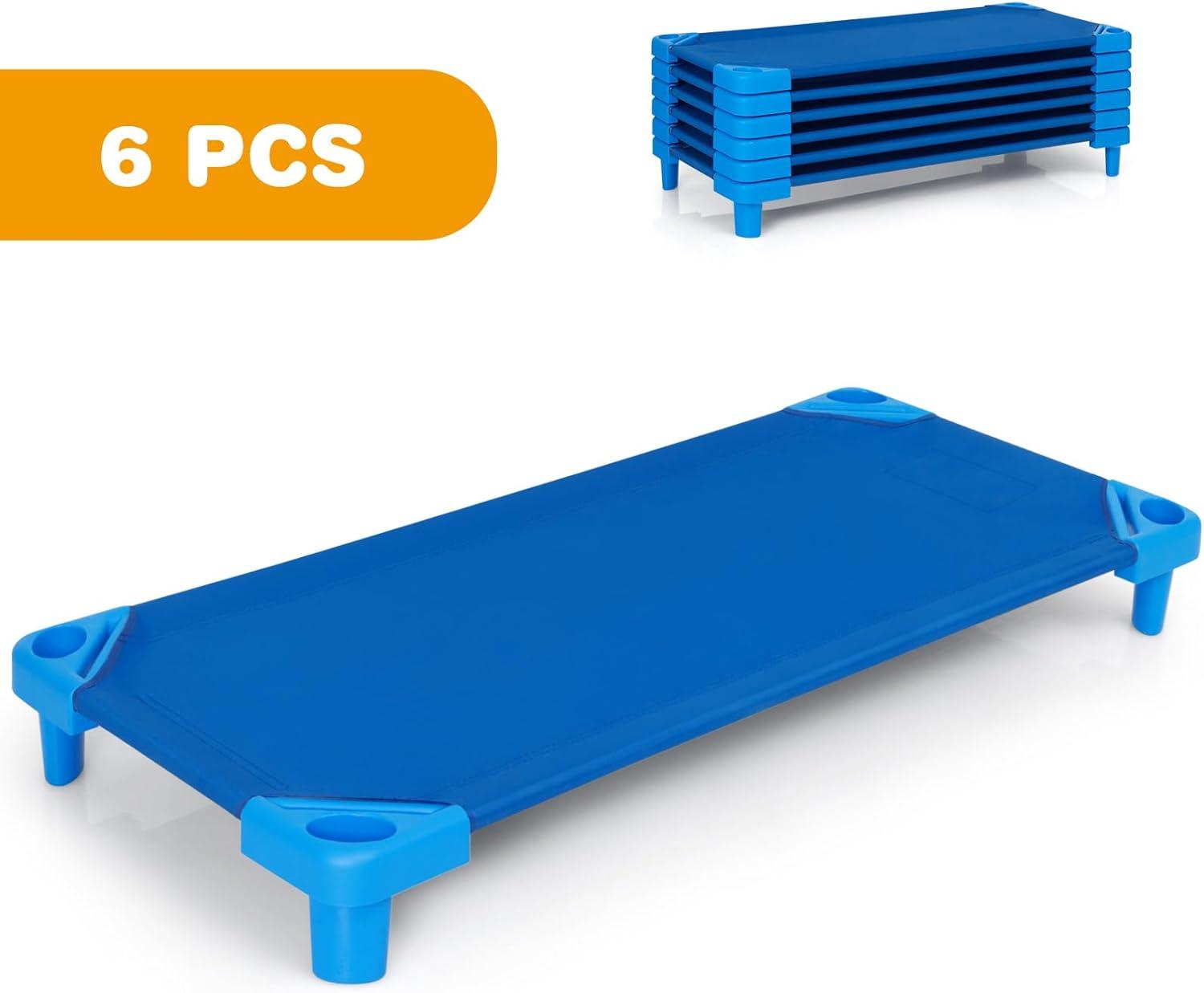 Daycare Cots, 6-Pack Stackable Nap Bed Cot with Easy Lift Corners, Portable Children Sleeping Cots for Preschool Classroom, Nursery, Ready-to-Assemble (Sand)(Blue)