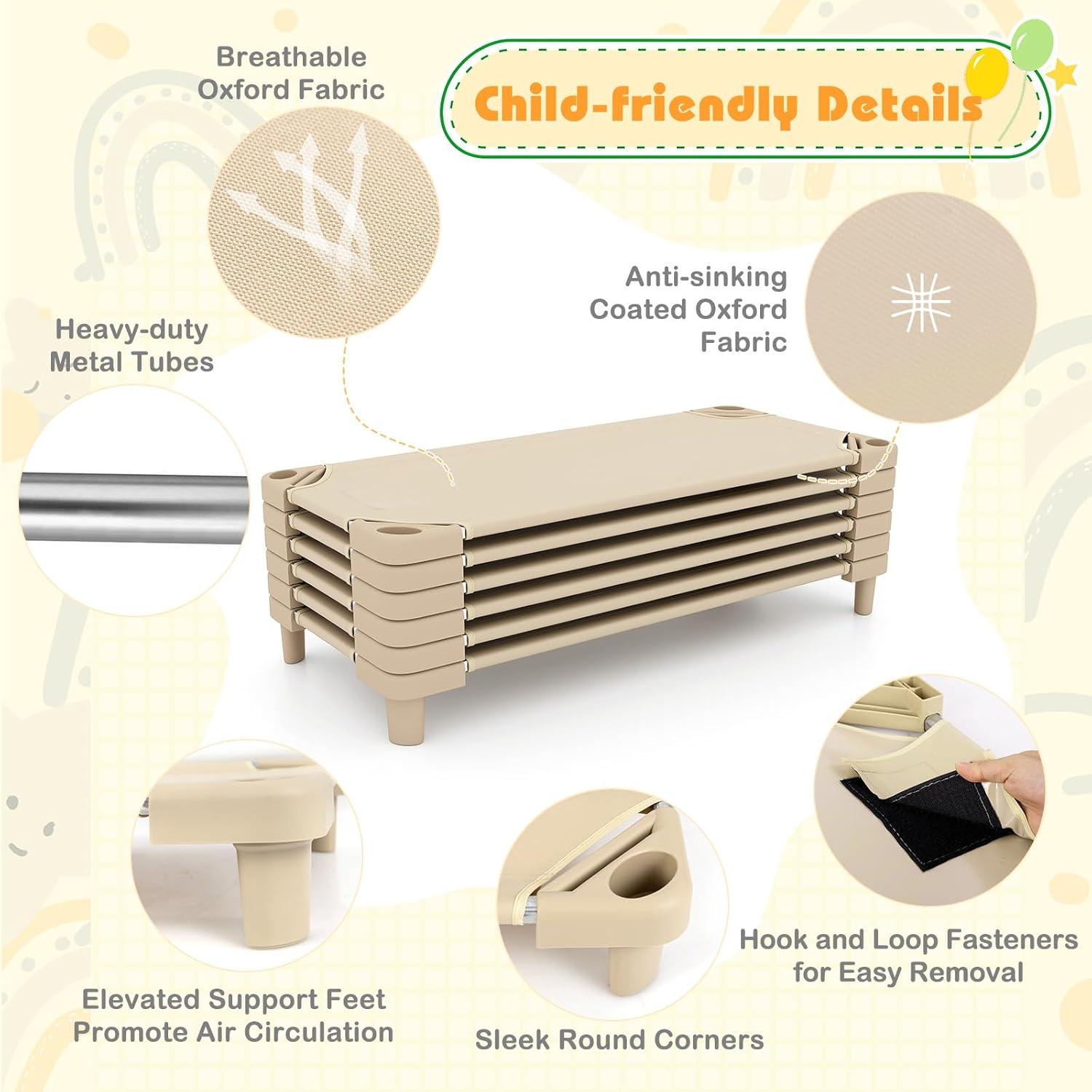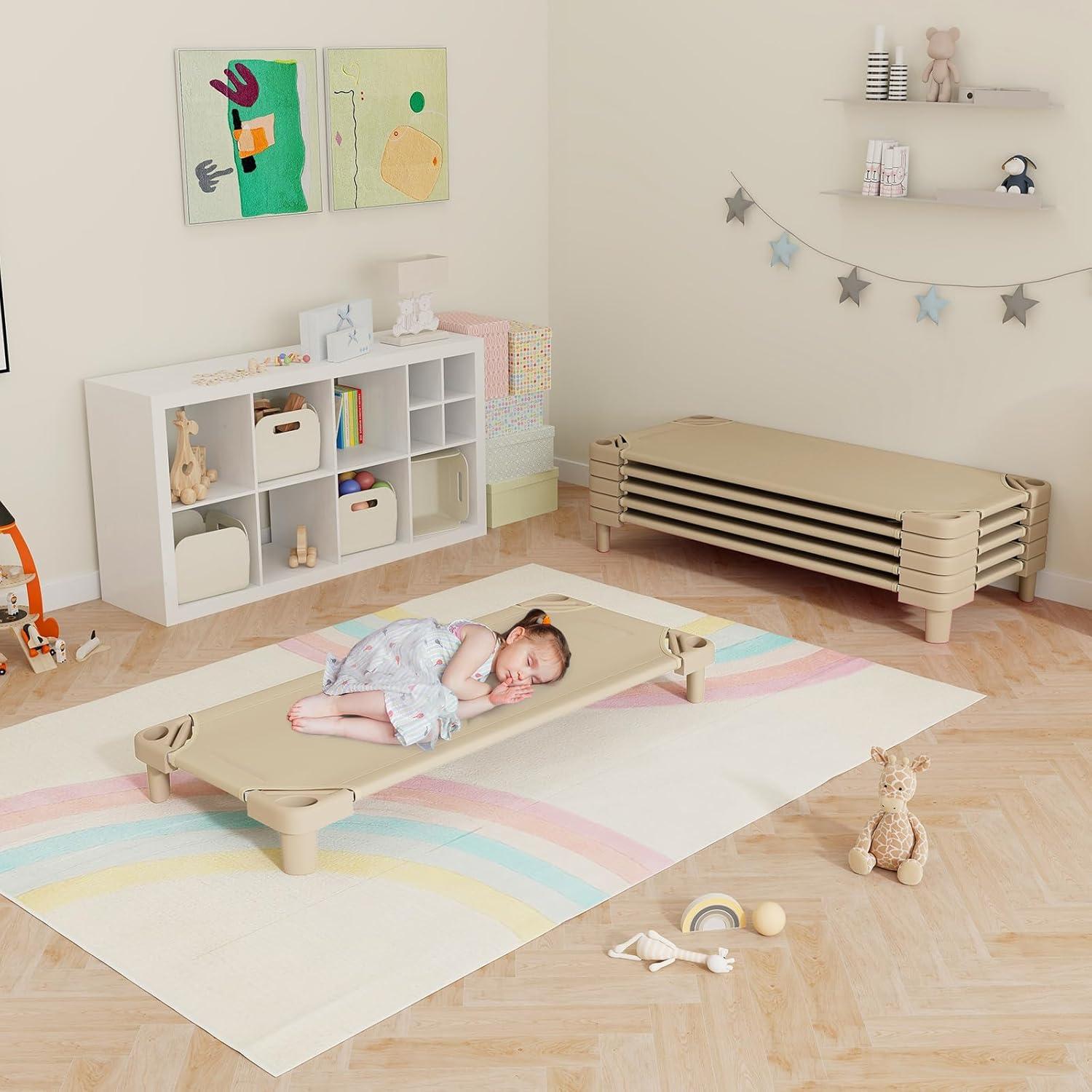 This daybed is specially designed for babies and is made of high quality 300D Oxford fabric, which is wear-resistant, durable, breathable and soft to the touch, wrapping around the baby as if it were a cloud, giving them an unparalleled comfortable sleeping experience. The frame is made of sturdy and durable metal, with a load-bearing capacity of up to 130 pounds. The unique stackable design is the savior of small space, multiple daycare beds can be easily stacked for storage, which saves space and is easy for families to store and move. The preschool bed is designed with user convenience in mind, and can be assembled in minutes with just a few simple steps without screws or tools, which greatly saves installation time and makes maintenance easier. In addition, this children's bed is not only suitable for home daycare centers, but can also be perfectly integrated into the living room, bedroom, balcony and other scenes in the home.