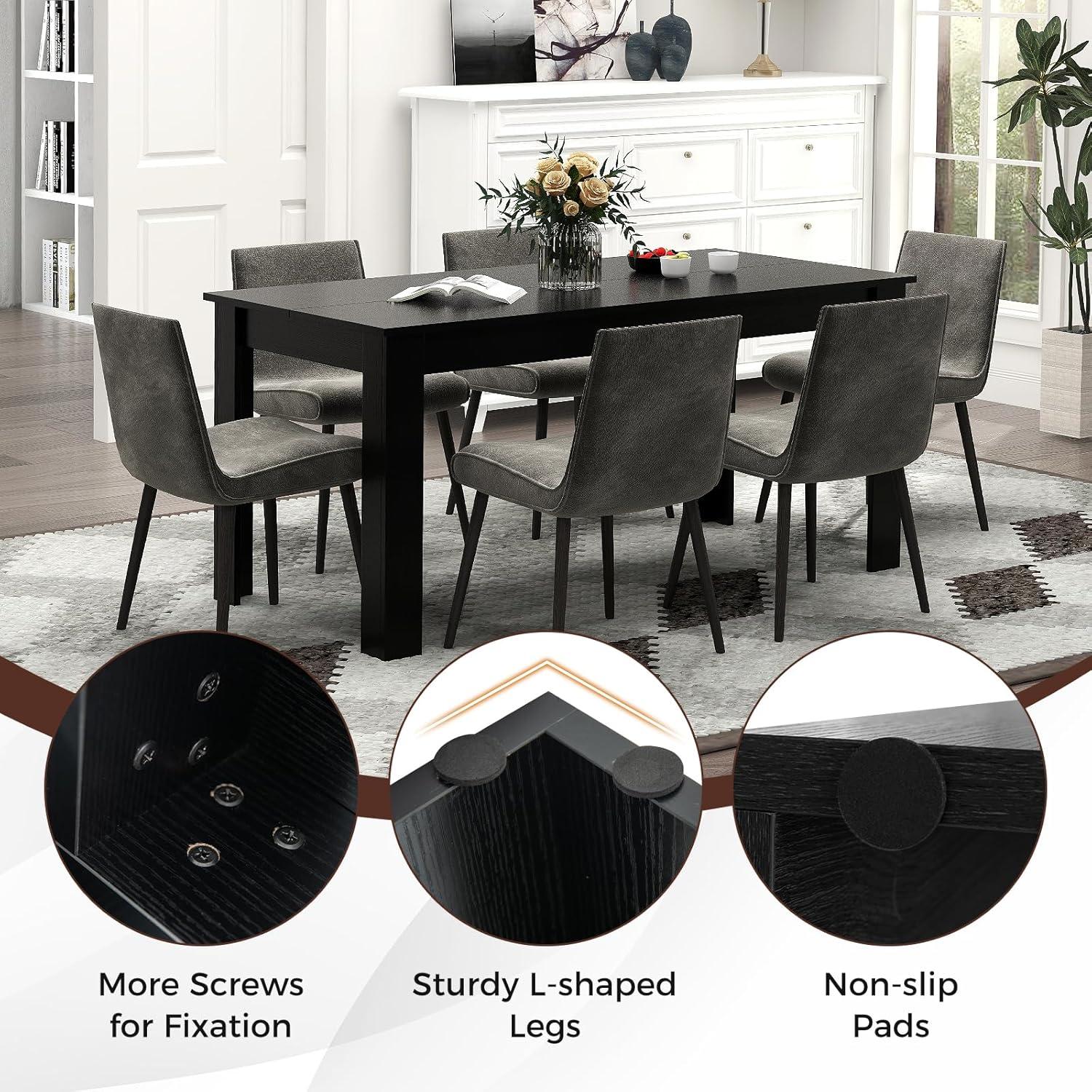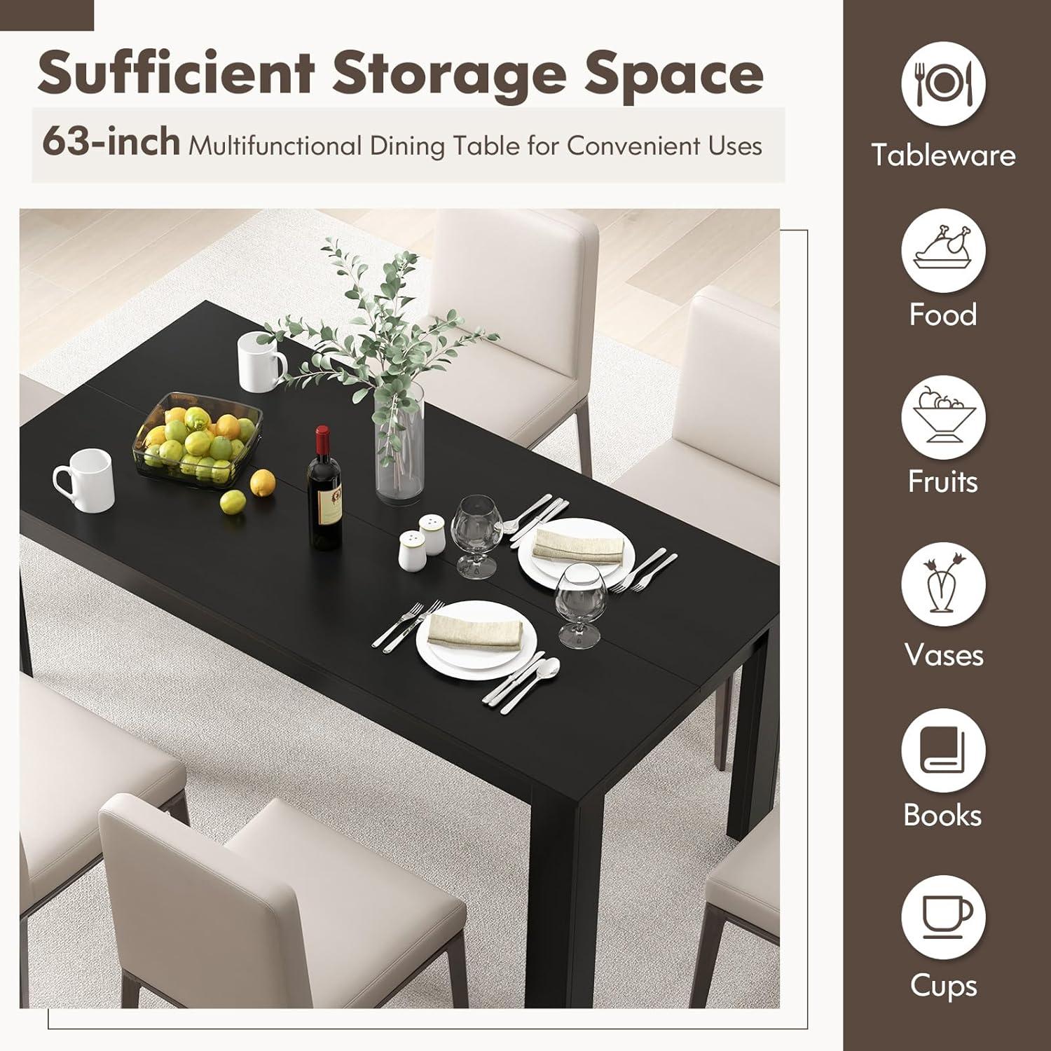 The dining table features 63” wide tabletop which is suitable for 4-6 people to enjoy comfortable dine time together, creating a generous and welcoming atmosphere for engaging meals and conversations. Crafted from veneered board, this dining table boasts superior quality and easy maintenance. We are offering 3 color options for you, and you can choose the one fit best for your home decoration.