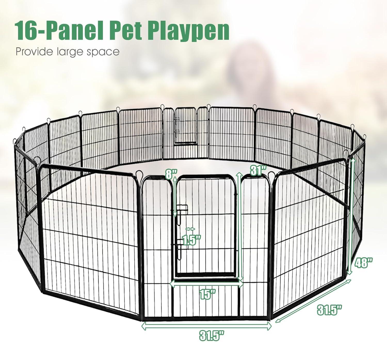 Safe and Relaxing Space for Pets: Our dog playpen offers a secure and comfortable area for your beloved pets to rest and play. With 14 panels and 2 gate panel measuring 48”(H) x 31”(W), it creates an extra large space where your pets can run and play happily. Our dog fence also ensure a semi-open space for your pet friends to breathe fresh air and smell the new-mown grass.