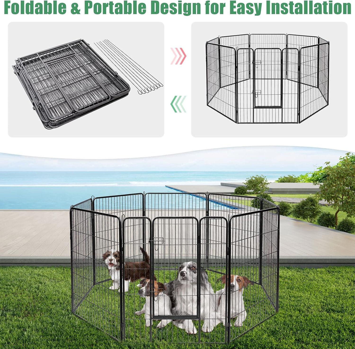 Easy Assembly and Portability: Setting up our dog exercise pen is a breeze: simply connect each panel together without the need for any tools. The playpen can also be easily folded down flat for convenient storage and transportation, making it ideal for trips and camping adventures.