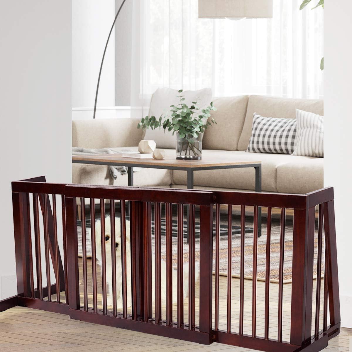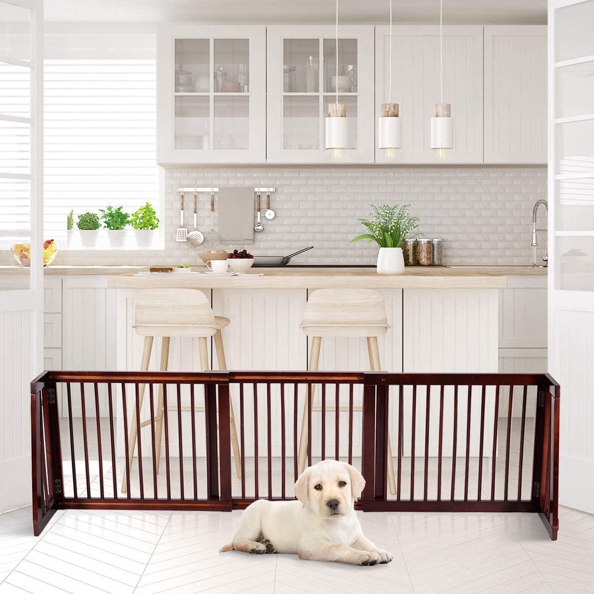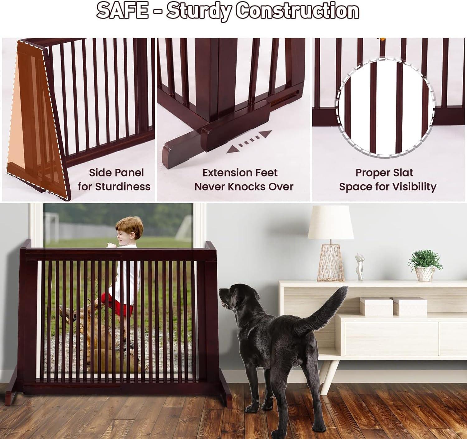 [Premium Material & Stable Structure]: Made of well painted solid pine wood, together with widening feet, our freestanding pet barrier is sturdy and stable enough that can holds up by itself wherever you put it. Non-slip rubber feet protectors will provide additional stability to the panels.