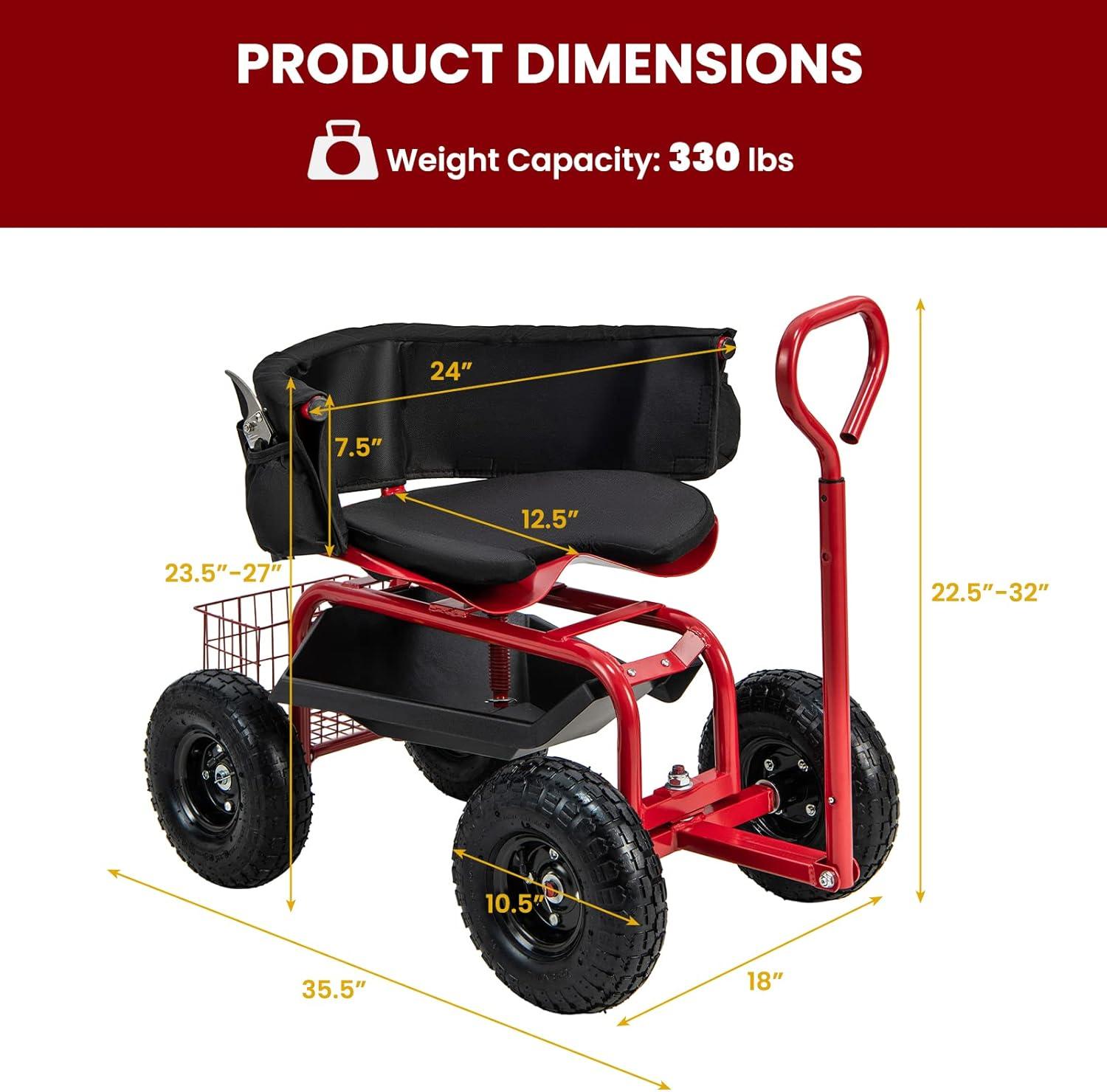 Smooth Ride on Various Terrains: Equipped with large 10.5″ wheels, this garden stool with wheels glides smoothly across a variety of surfaces, including dirt paths, gravel, and grass. Designed for excellent traction, the wheels ensure a stable and easy ride, even over uneven or challenging ground. The cart measures 35.5″ x 24″ x 23.5″-27″ (L x W x H), providing a comfortable working experience