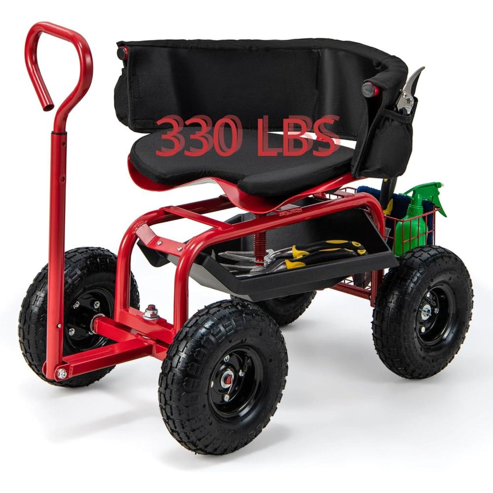 Sturdy Construction for Heavy Outdoor Use: Crafted with a robust metal frame, this gardening cart with seat supports up to 330 lbs, making it ideal for a variety of outdoor tasks. Its specially treated coating enhances durability, ensuring it can handle the rigors of gardening, landscaping, and yard maintenance across different seasons