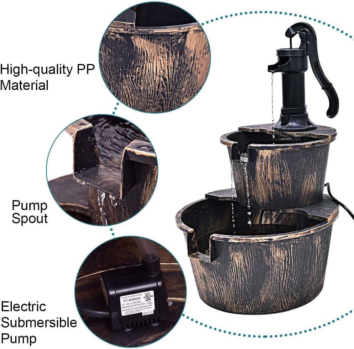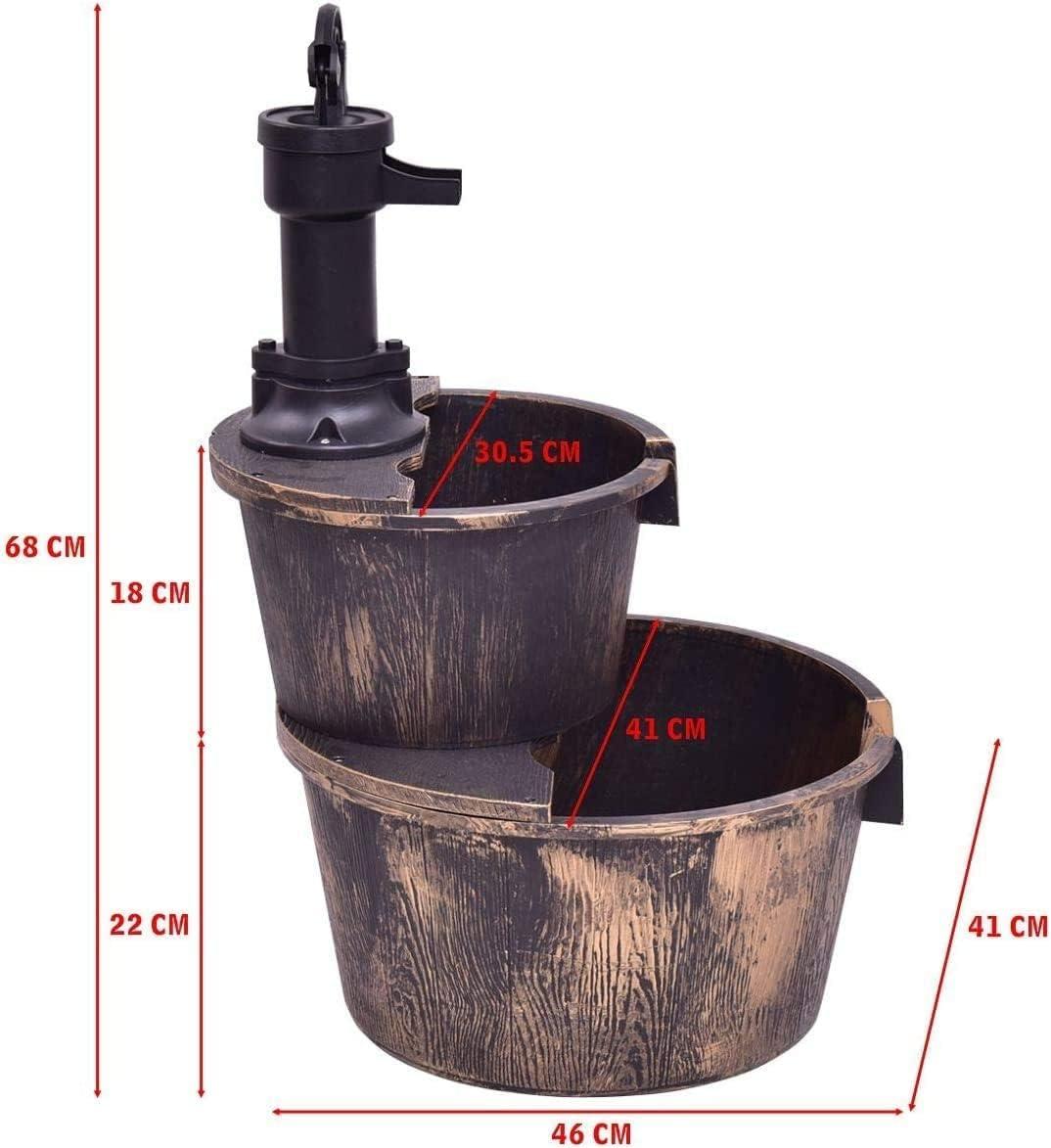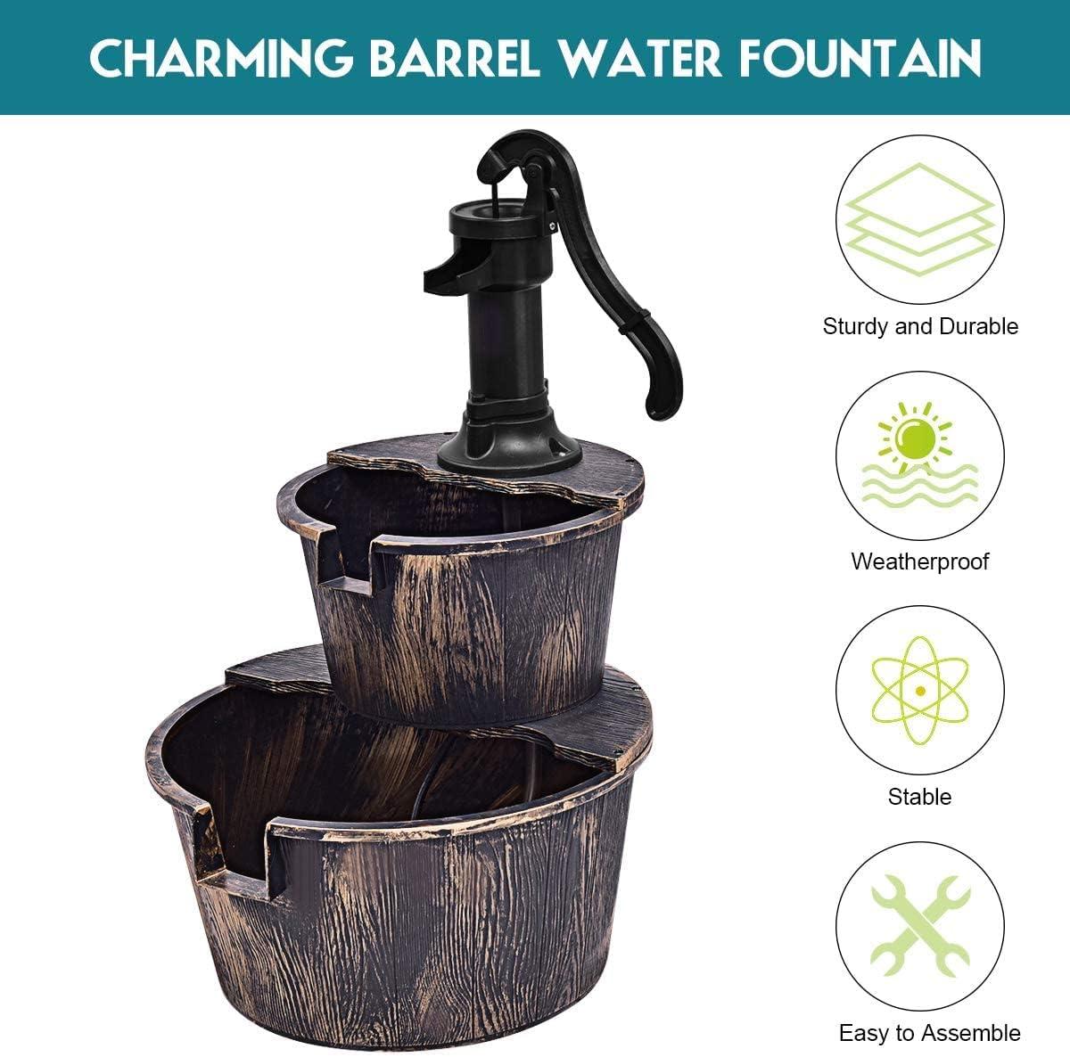 Description: Do you want to decorate your garden with a barrel fountain? Our barrel waterfall fountain will not disappoint you. This barrel waterfall fountain is made of high-quality PP material, which guarantees good quality. The durable material can be used outdoors for a long time. In addition, this barrel waterfall fountain is equipped with an electric submersible pump, which allows the water to flow slowly between the 2 barrels, creating a peaceful and elegant environment for you. This barrel waterfall fountain has 4 suckers, allowing it to maintain strong stability outdoors. The rustic imitating bronze color gives people an old-fashioned western feel, and brings a unique country style to the garden. Such a charming decoration is suitable for decorating many places, and can be used to decorate yards, gardens, backyards and so on. Features: Relaxing water flow brings a sense of peace and relaxation High quality PP material for long outdoor use 120V UL-certified electric pump create an independent water circulation system Antique imitating bronze color gives people an old-fashioned western feel 4 suckers for fixing provide strong stability Ingenious gap design allows water to flow between 2 buckets Ideal for gardens, decks, backyards, yards, etc. Easy to assemble and use Specifications: Color: Imitating Bronze Color Material: PP Overall Dimension:18” x 16” x 27” (L x W x H) Pump Power: 120V/0.09A 60Hz Net Weight: 6 lbs Package includes: 1 X 2-Tier Barrel Water Fountain 1 X User Guide