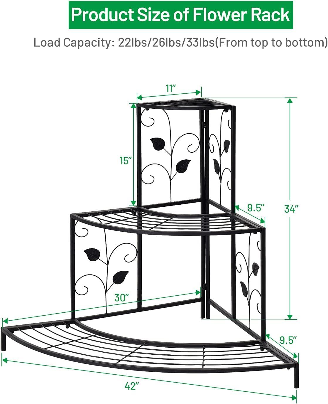 Easy Assembly: This plant fixed display stand measures 42 “L x 30 “W x 34 “H. The package includes all the parts to assemble the garden corner shelf. You only need to make some small adjustments to level the shelf, which doesn't take much of your time and effort, and you will get the perfect plant stand.