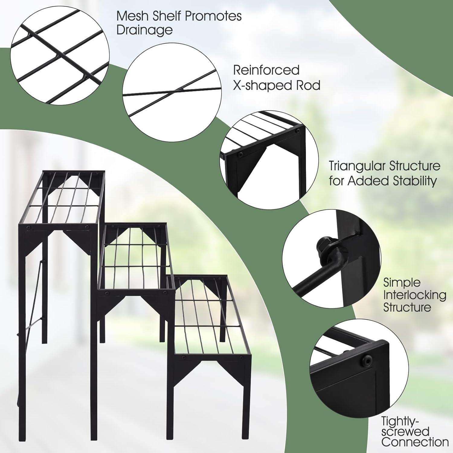 3 Tier Display & Growth Design: This 3-tier stepped metal plant stand provides you with a wonderful space to display different plants, and the design greatly enhances space utilization. There is no obstacle on top of each tier, which allows plants to grow freely and enjoy the sunlight.