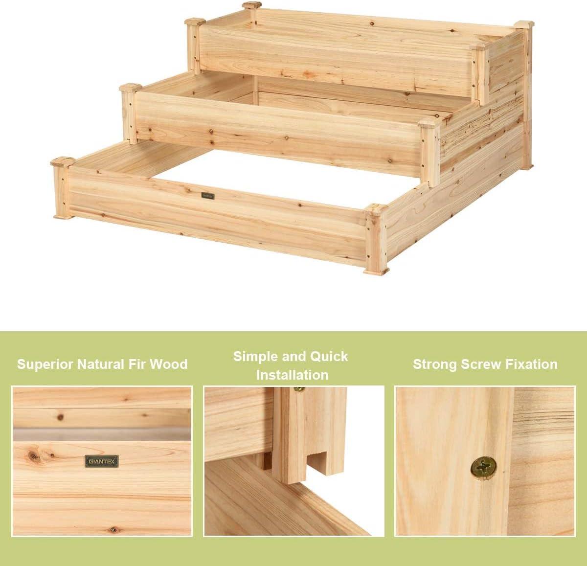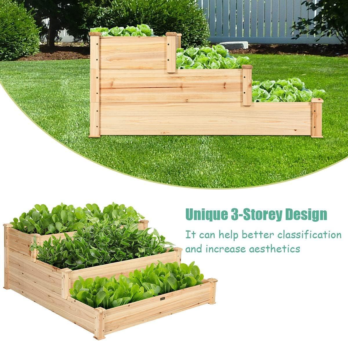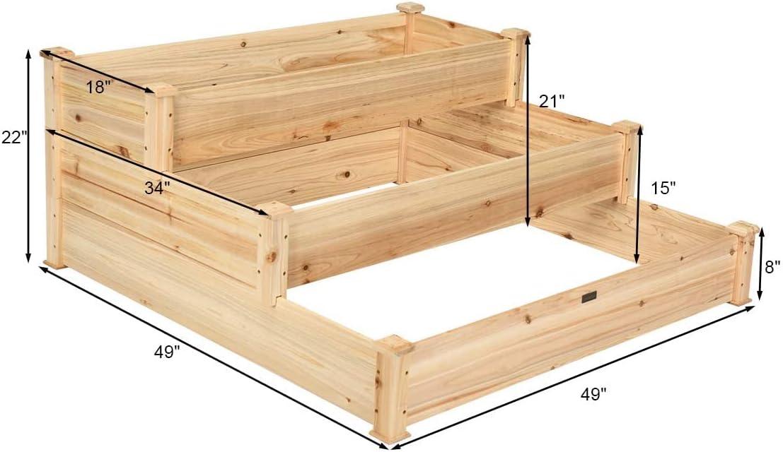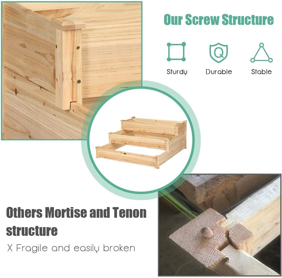 Our raised garden bed has a 3-tier design, which is convenient for management and classification of plants. This wooden raised garden bed has ample plant space to meet your large plant needs, you can grow flowers, plants, herbs, fruits, etc. all the plants you like.The important thing is the hollow design at the bottom, which allows plants to directly contact the soil and better obtain water and nutrients. Our garden bed is made of high-quality fir wood and can be used outdoors for a long time. With a natural appearance, this garden bed can bring a natural feel to your home. You can put it in grass, lawn, patio, backyard, etc. It will be the perfect decoration for your home.