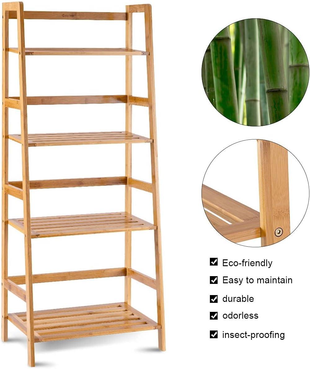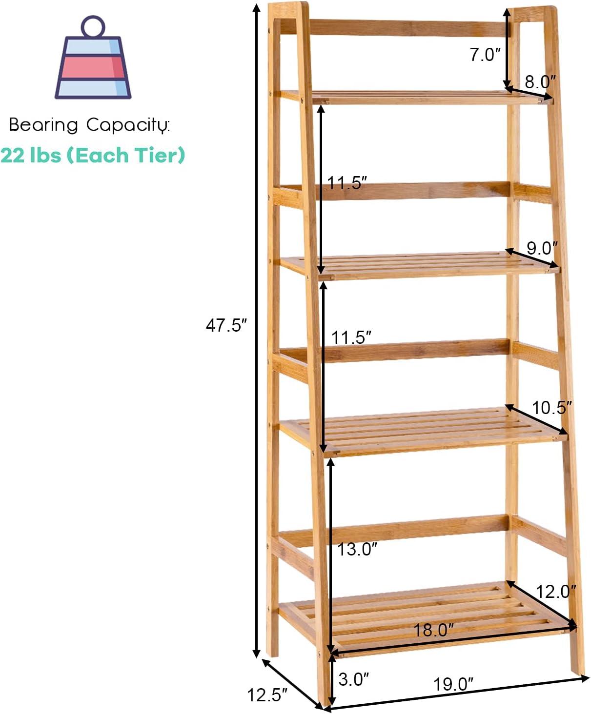 Description: Our bambooladder shelf help you keep your items in order. This 4-tierbookshelfprovides ample storage space. The shelf widens from top to bottom, which brings better stability to the bookshelf. The high-quality bamboo material does not emit any peculiar smell and is difficultto crack and deform. The stable base ensures that the bookshelf stand firmly on the ground, and each layer can bear a weight of 22 pounds. Your plants and flowers can be displayed elegantly on this shelf while saving space on the balcony. The side wall and back wall baffle can effectively prevent items from accidentally falling. The multifunctional storage rack can be used to place books, plants and flowers, artworks and kitchen utensils, etc. It is suitable for balcony, study room, living room, kitchen. If you are looking for a practical bookshelf, please do not miss our products. Features: 4-tierlarge space shelf, can put more items Heightbetween each shelfis appropriate to provide plenty of sunlight for the plants High-quality bamboo, durable Stable structure with good load-bearing Baffles on the back and sides prevent items from accidentally slipping off Suitable for balcony, study room and kitchen Treated surface is smooth to the touch & easy to clean Specifications: Materials: Natural Bamboo Color: Natural Overall Dimension: 19inchx12.5inchx47.5inch( LxWxH ) Net Weight: 11lbs Weight Capacity:45lbs PackageIncludes: 1x BambooLadder Shelf 1 x Instruction Manual
