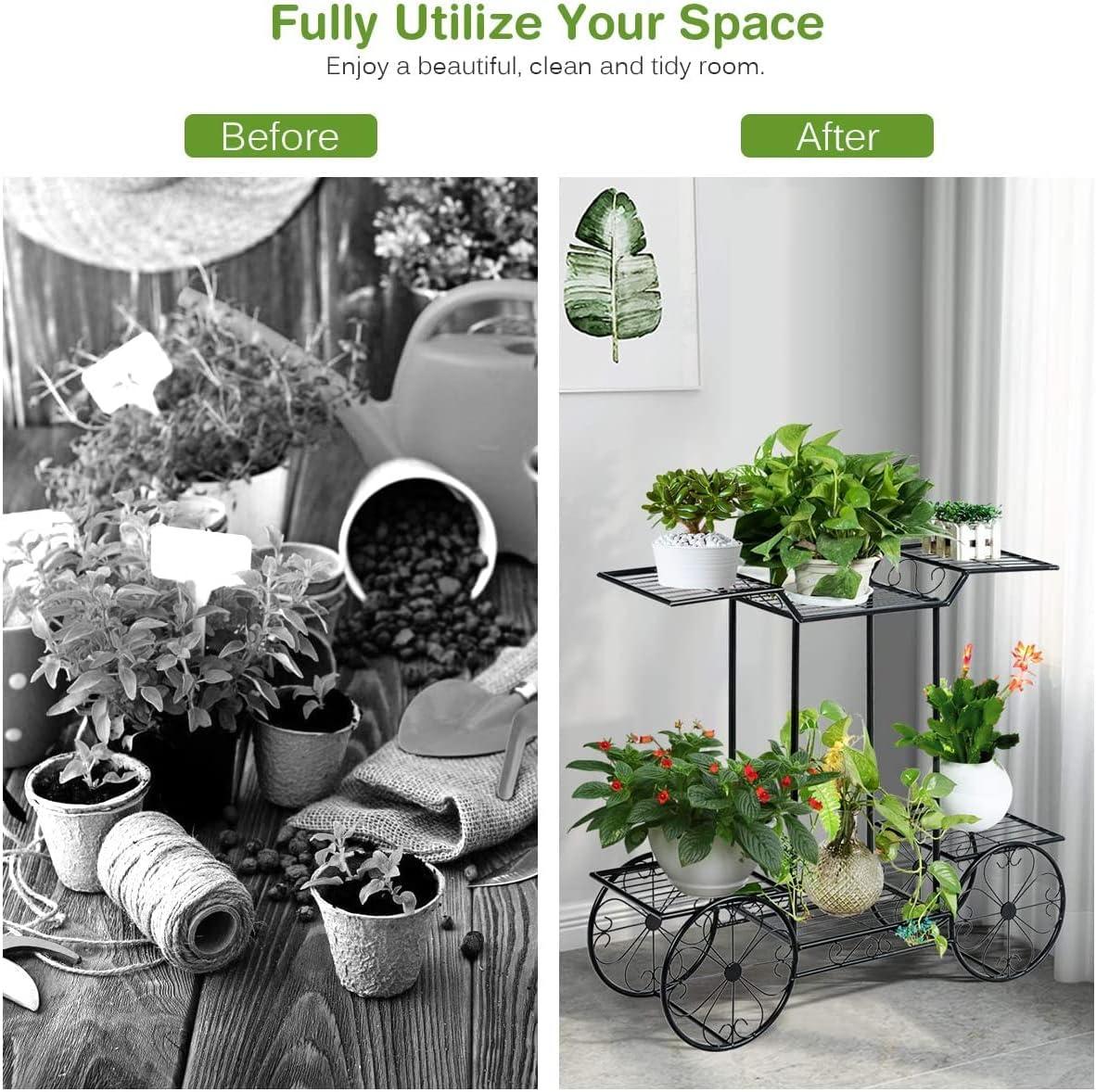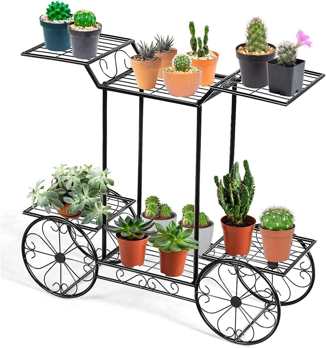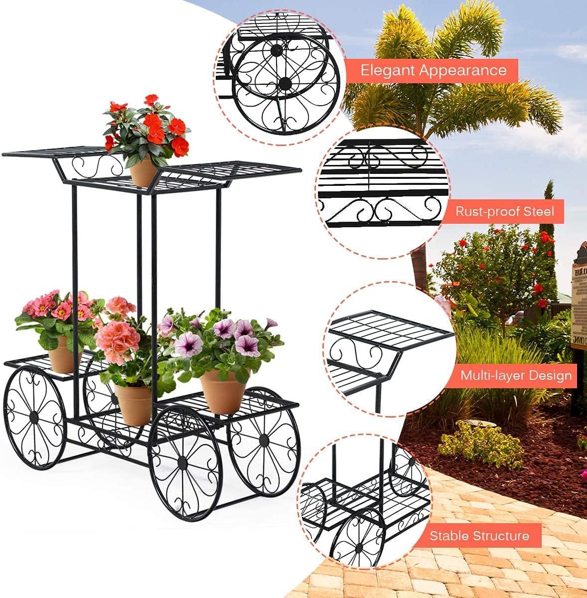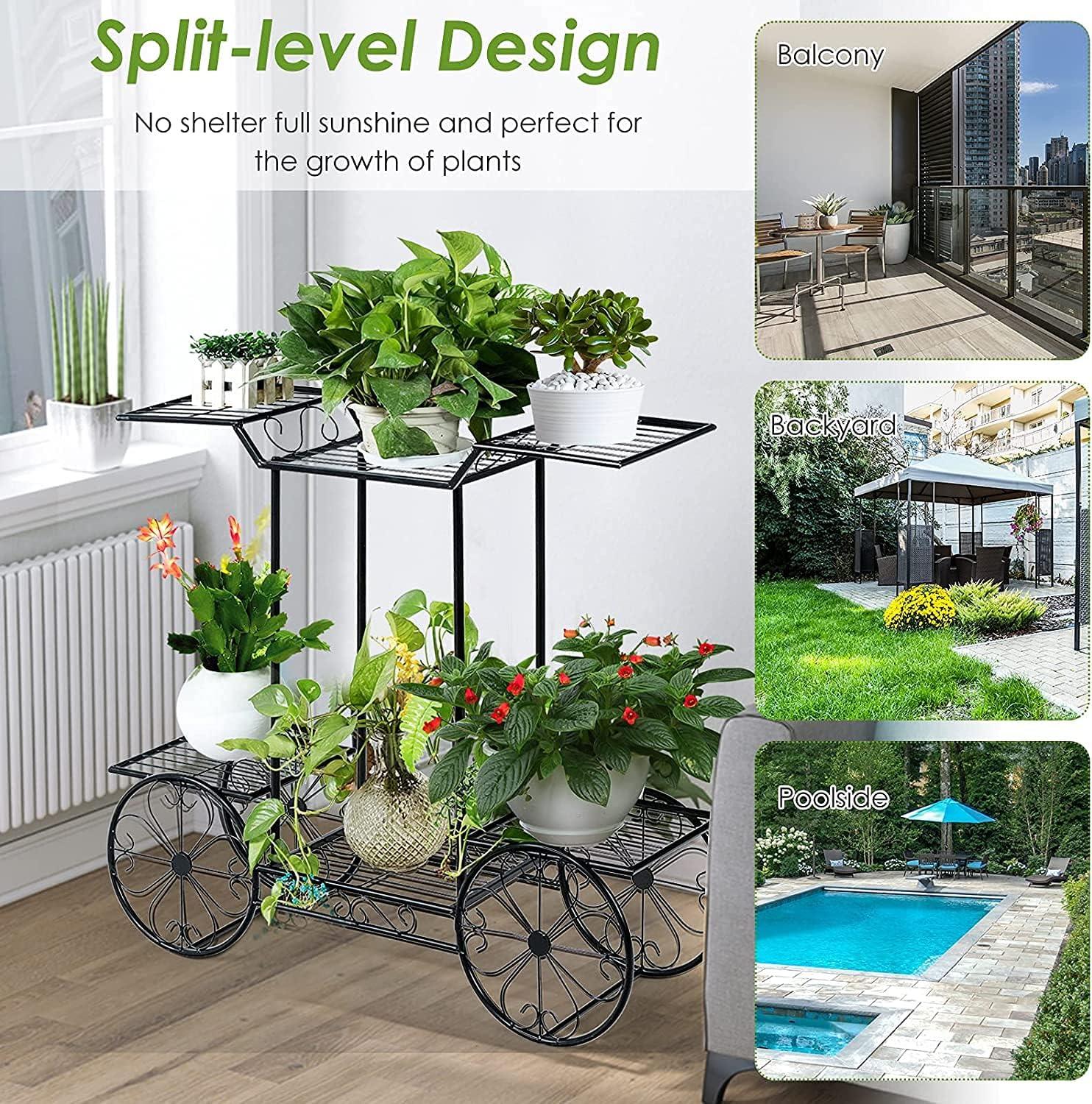 Our plant stand has 6 open shelves, which can provide you with plenty of storage and display space. This plant stand has a metal structure, which is stable and strong and can be used for a long time. The attractive feature is that this plant shelf comes with 4 decorative wheels and heart-shaped patterns on the wheels, making the whole shelf look more sophisticated. In addition, the good welding process makes its structure more stable and will not shake during use. This practical shelf can not only be used as a plant shelf to display flowers and plants, it can also be used as a storage shelf or display shelf for shoes, books, tools, etc., to meet your diverse needs. This metal stand is suitable for indoor and outdoor use, you can put it on the balcony, living room, garden and so on.