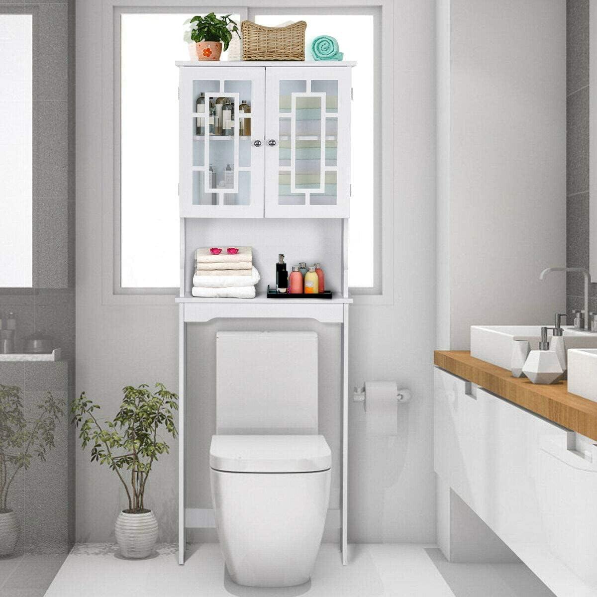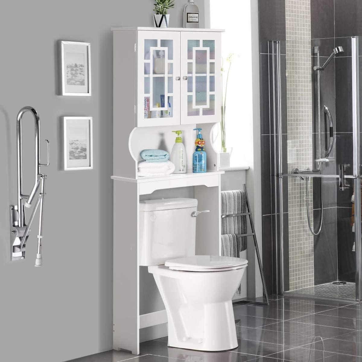 GRAFFY Over The Toilet Storage Cabinet, Bathroom Space Saver Stands with Adjustable Shelf, Open Storage Shelf & Double Doors, Freestanding Toilet Organizer, Wooden Above Toilet Rack, White (White)(White)