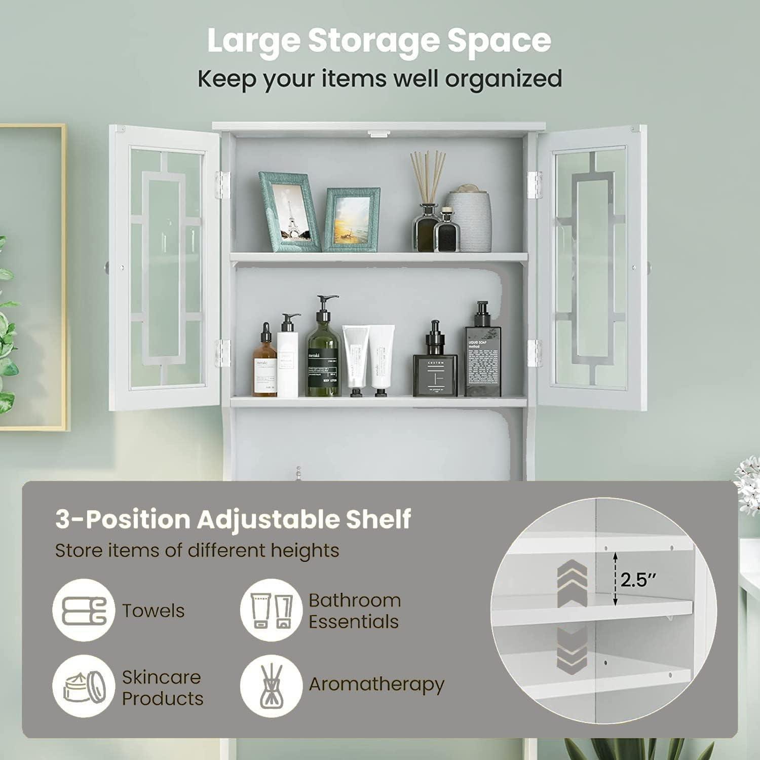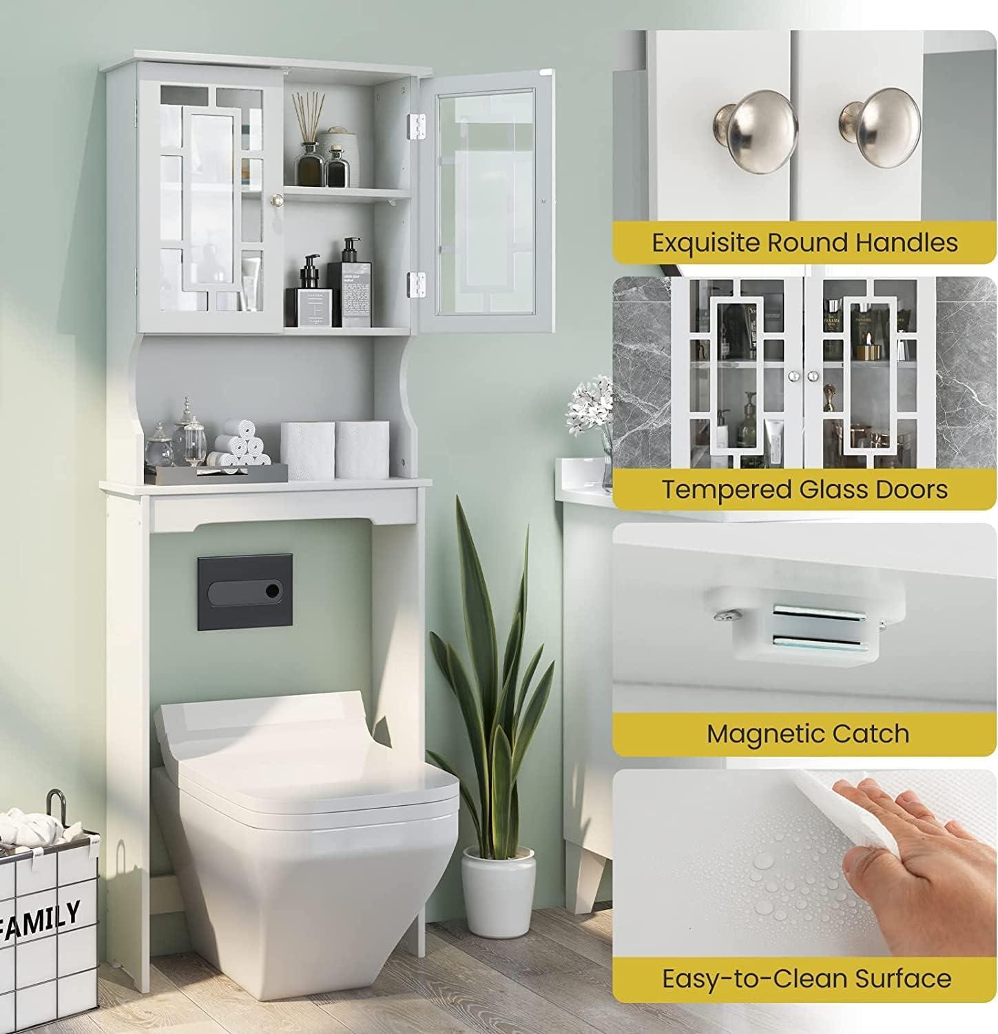 GRAFFY Over The Toilet Storage Cabinet, Bathroom Space Saver Stands with Adjustable Shelf, Open Storage Shelf & Double Doors, Freestanding Toilet Organizer, Wooden Above Toilet Rack, White (White)(Grey)