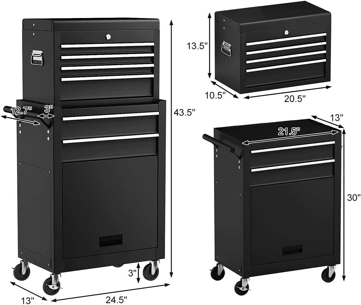 This tool cabinet is made of high quality cold rolled sheet, which is durable and sturdy. The surface is treated with high quality powder coating, which greatly improves the service life of the product. 6 drawers + 1 compartment provide you with plenty of storage space. The top box is removable and equipped with a central lock to protect your important items from others. 4 universal wheels and handrails help to move the tool cabinet.