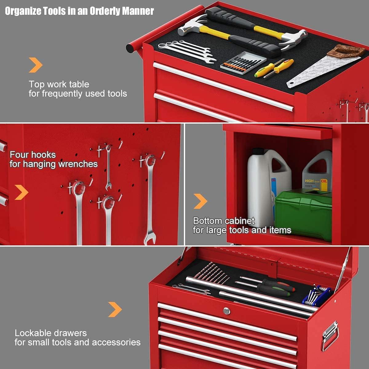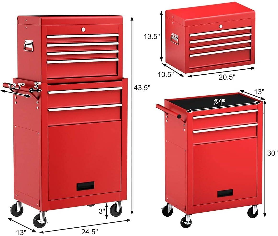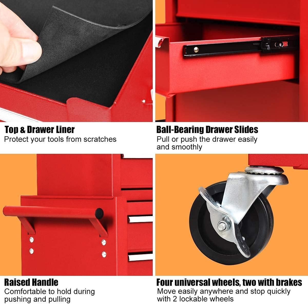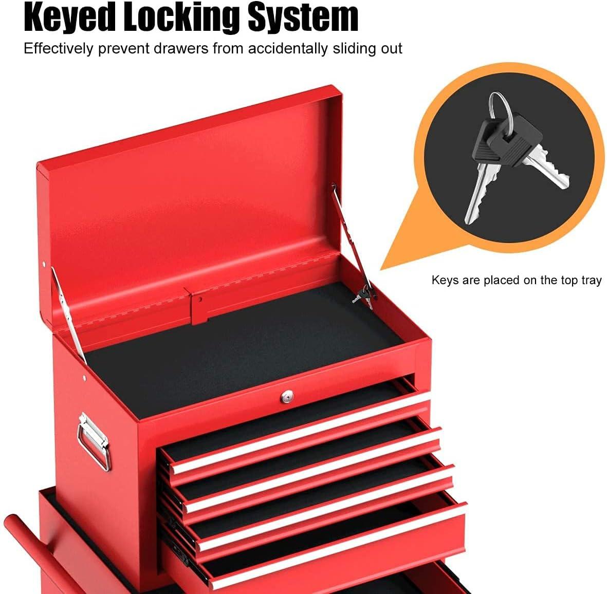 Tool Chest, 5-Drawer Rolling Tool Storage Cabinet w/Auto Locking System & Lockable Wheels, Detachable Top Tool Box, Metal Tool Cart for Warehouse Garage Workshop Barbershop Repair Shop, Red(Black)