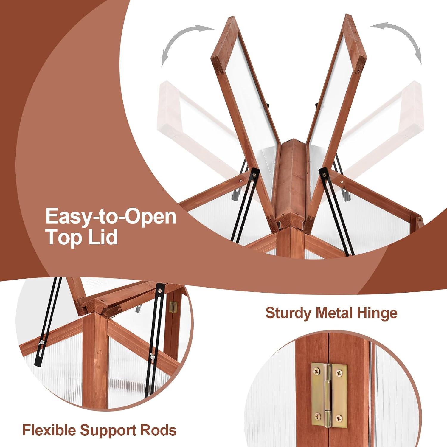 Description: Do you want to plant flowers or green plants in every season? This wooden garden cold frame can extend the growing season of plants and flowers and provide a good growth environment for plants throughout the year. Our wooden garden greenhouse is made of high-quality fir wood, which is not easy to crack and can be used for a long time indoors and outdoors. In addition, the solid and stable solid wood frame provides strong stability. It is worth mentioning that the foldable top can promote air circulation and sunlight absorption. With plenty of planting space, you can grow any plants or flowers you want. With a visual greenhouse, sunlight can better shine on plants and better promote their growth. With a portable design, you can use it in gardens, yards, living rooms and other places to create your own mini garden. Features: Large internal space provides plenty of planting space 2 foldable tops can protect plants from rain in rainy days The visual design allows sunlight to reach the plants Portable garden greenhouse that extends the growing season of plants The sturdy and durable fir wood can stand the test of time 2 bolts on both sides for fixing the top allow you to use it in different weather. Suitable for living room, garden, backyard, etc. Easy to assemble and move Specifications: Material: Fir wood + PC board Hinge Length: 10″ Product Dimension: 35.5″ x 31.5″ x 23″ (L x W x H) Net Weight: 13.5 lbs Package includes: 1 X Wooden Garden Greenhouse 1 X User Guide