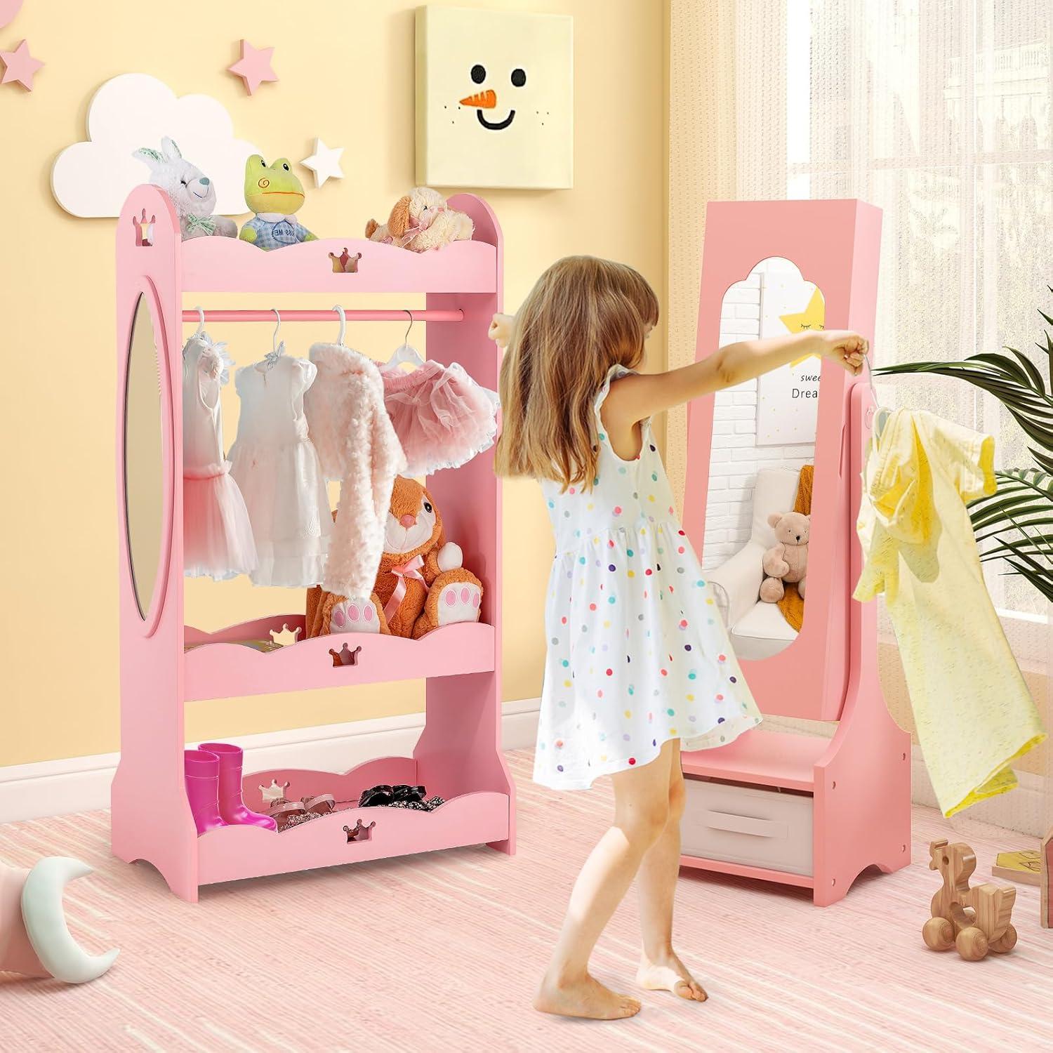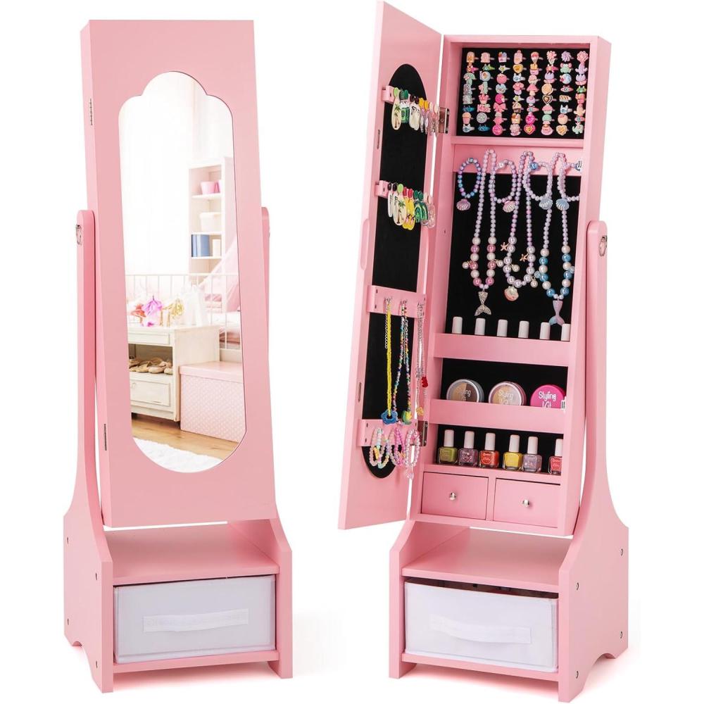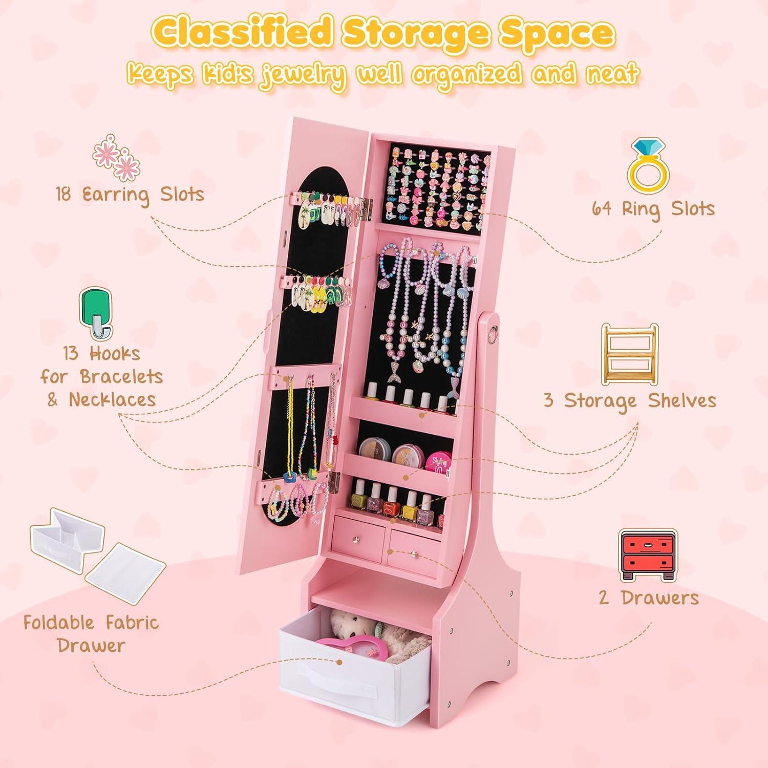 This kids jewelry armoire cabinet is a dream storage space designed for little jewelry lovers. It has a huge amount of storage features, including 18 earring slots, 13 necklace hooks, 64 ring slots, as well as 3 tiers of storage shelves, 2 small drawers, and a bottom foldable fabric drawer, to meet your child's storage needs for all kinds of jewelry and small items. The full-length mirror supports 2 angle adjustments to accommodate different heights and viewing needs, allowing your child to look their best at all times. The jewelry organizer is made of high-quality wood, which is stable and durable, and is equipped with an anti-tipping device to ensure safe use. In addition, we've paid attention to safety details, for example the cut-out handles that are easy to grip, and the soft close hinge and magnetic catch that lock gently and securely. This dress up vanity is not only a great organizer for your child, it's also the perfect gift to inspire self-confidence and creativity.