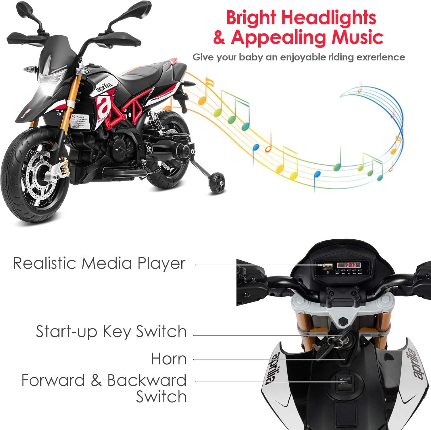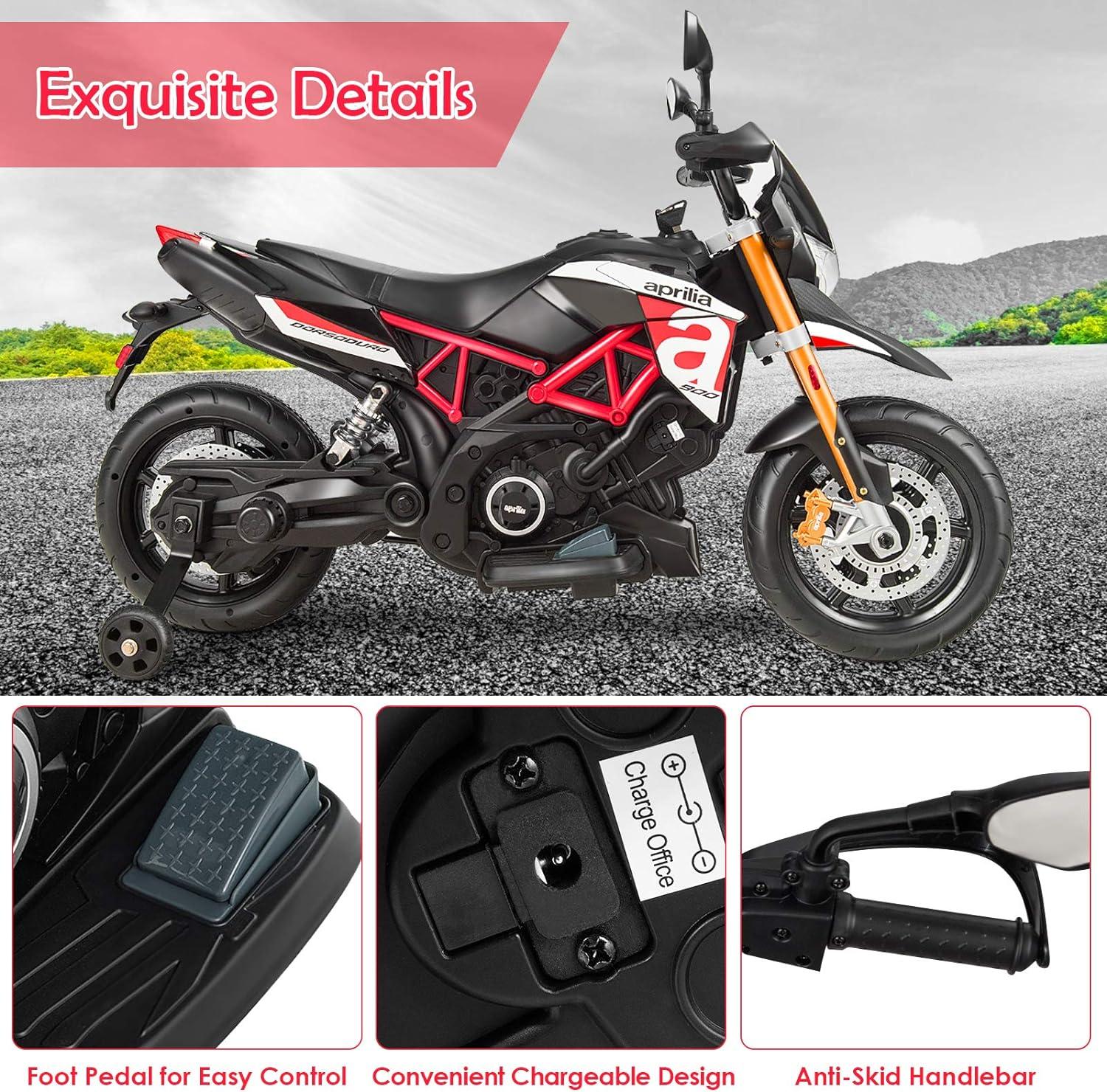 Kids Motorcycle, Aprilia Licensed 12V Battery Powered Ride On Bike w/Detachable Training Wheels, Anti-Skid Handlebar, Headlight & Music, Foot Pedal, Electric Bike for Kids Boys & Girls, Red(Black)