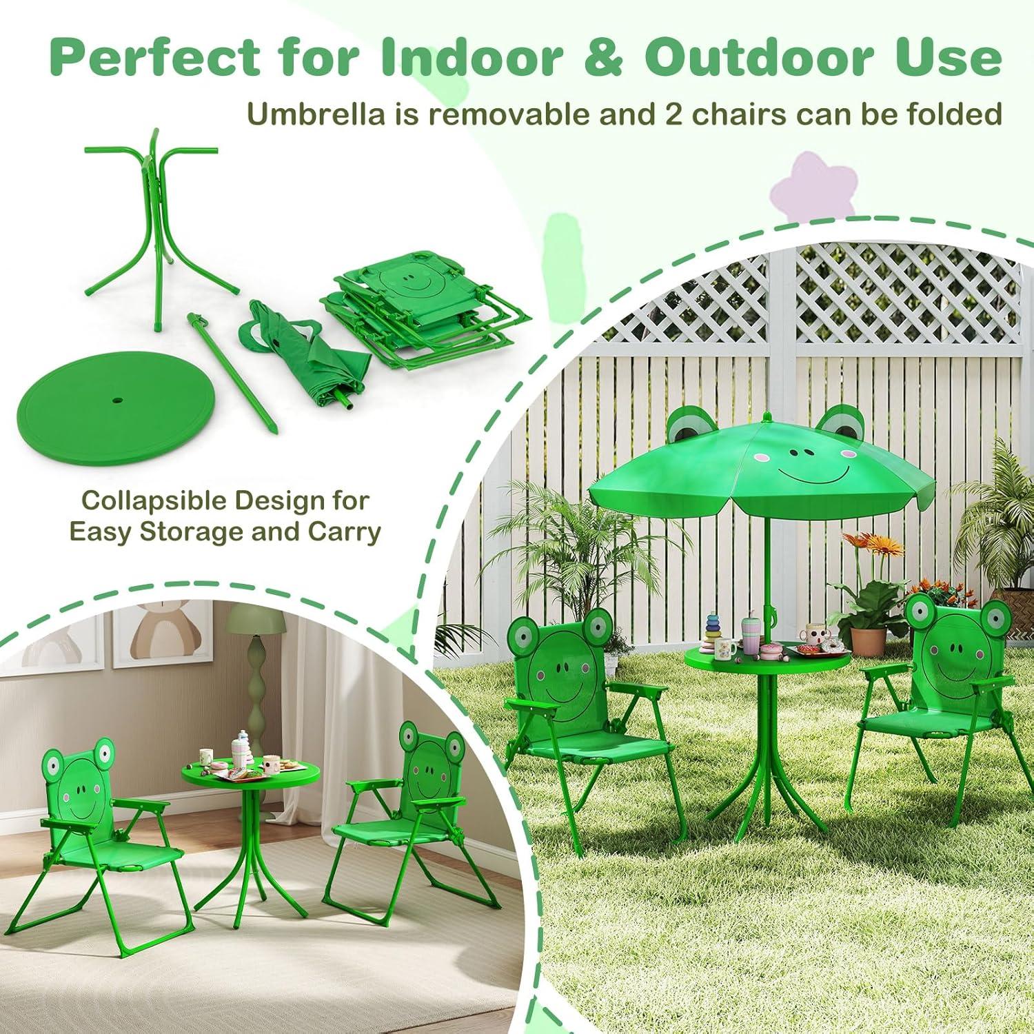 Kids Picnic Table, Kids Outdoor Table with 2 Folding Chairs, Removable & Height Adjustable Umbrella, Cute Animal Theme Children Outdoor Furniture for Patio, Garden, Backyard (Green Frog)(Green Frog)
