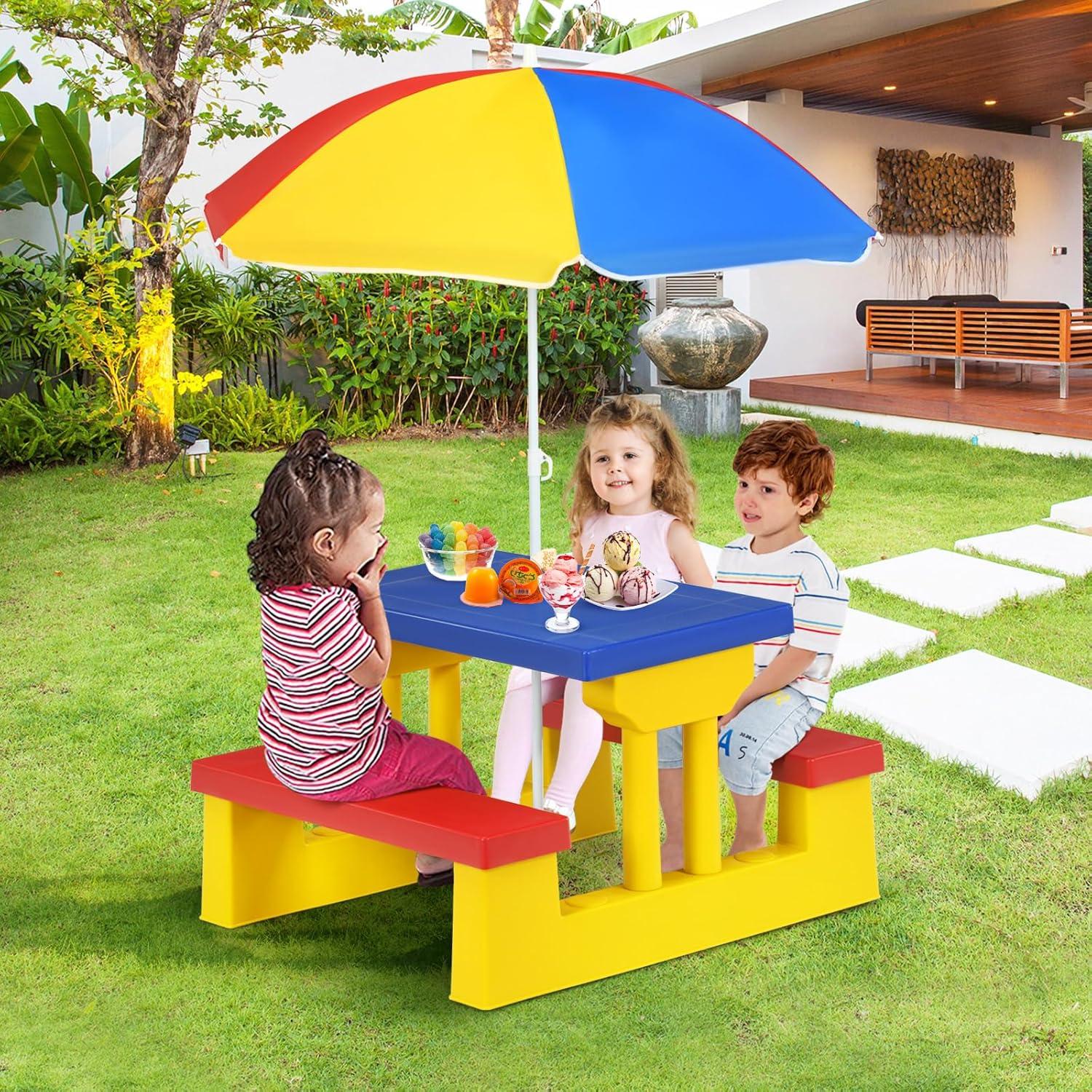 Kids Picnic Table, Toddler Plastic Outdoor Desk & Bench Set w/Removable Adjustable Umbrella, Gift for Boys Girls 3+, Kids Outdoor Table for Patio, Backyard, Sand Play, Camping (Red)(Colorful)