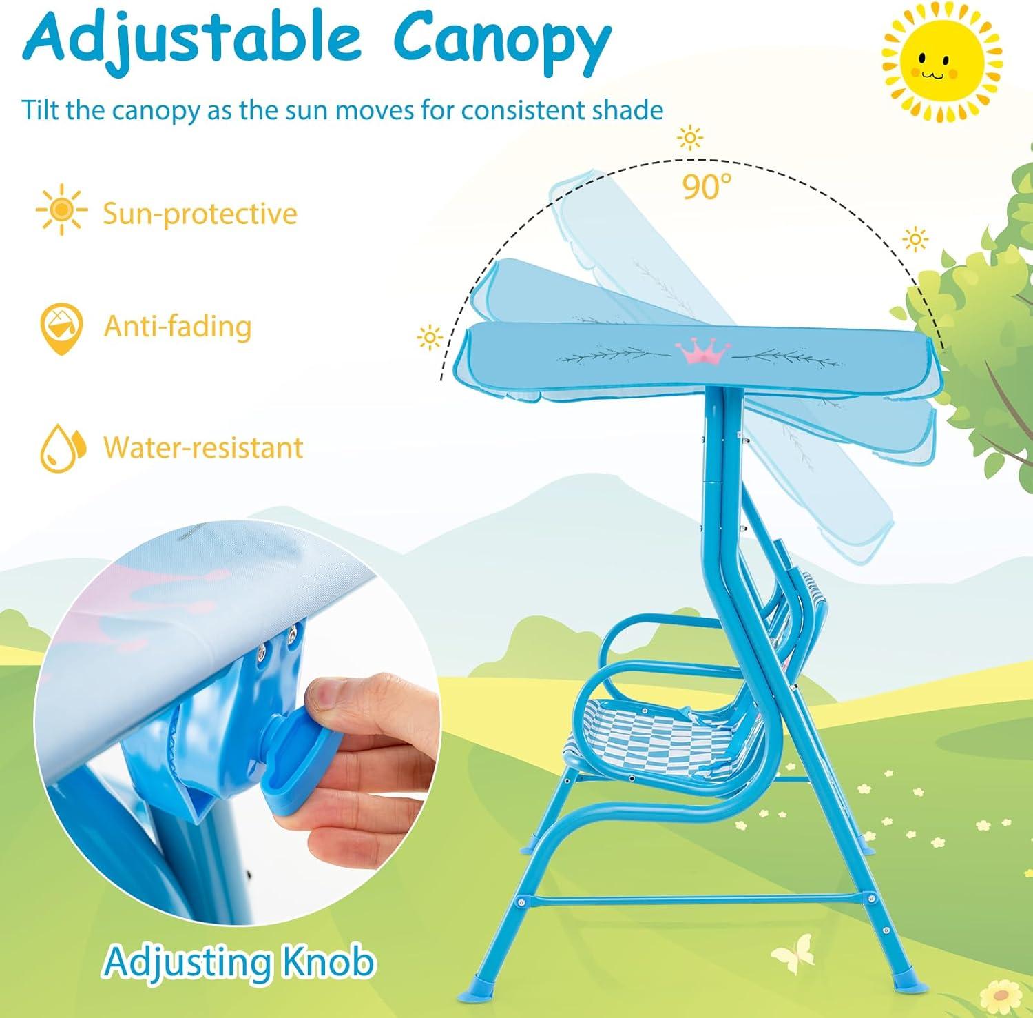 90° Adjustable Canopy: Featuring a selected oxford fabric canopy that provides superb sun protection, our children’s patio swing is waterproof and resists fading. You can effortlessly position the canopy at the perfect angle with an easy-to-use knob