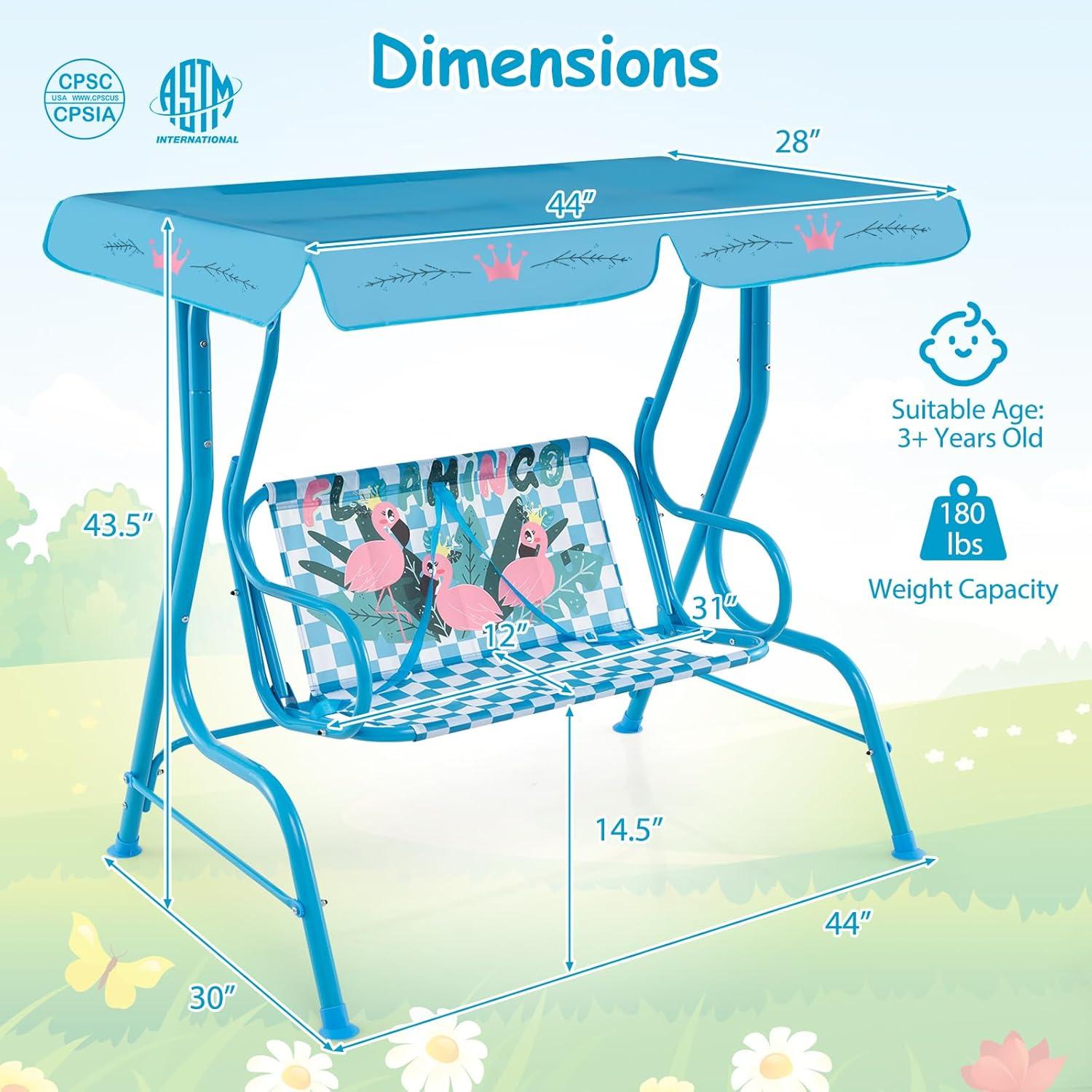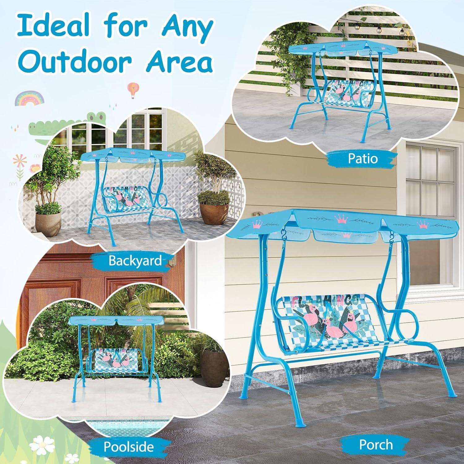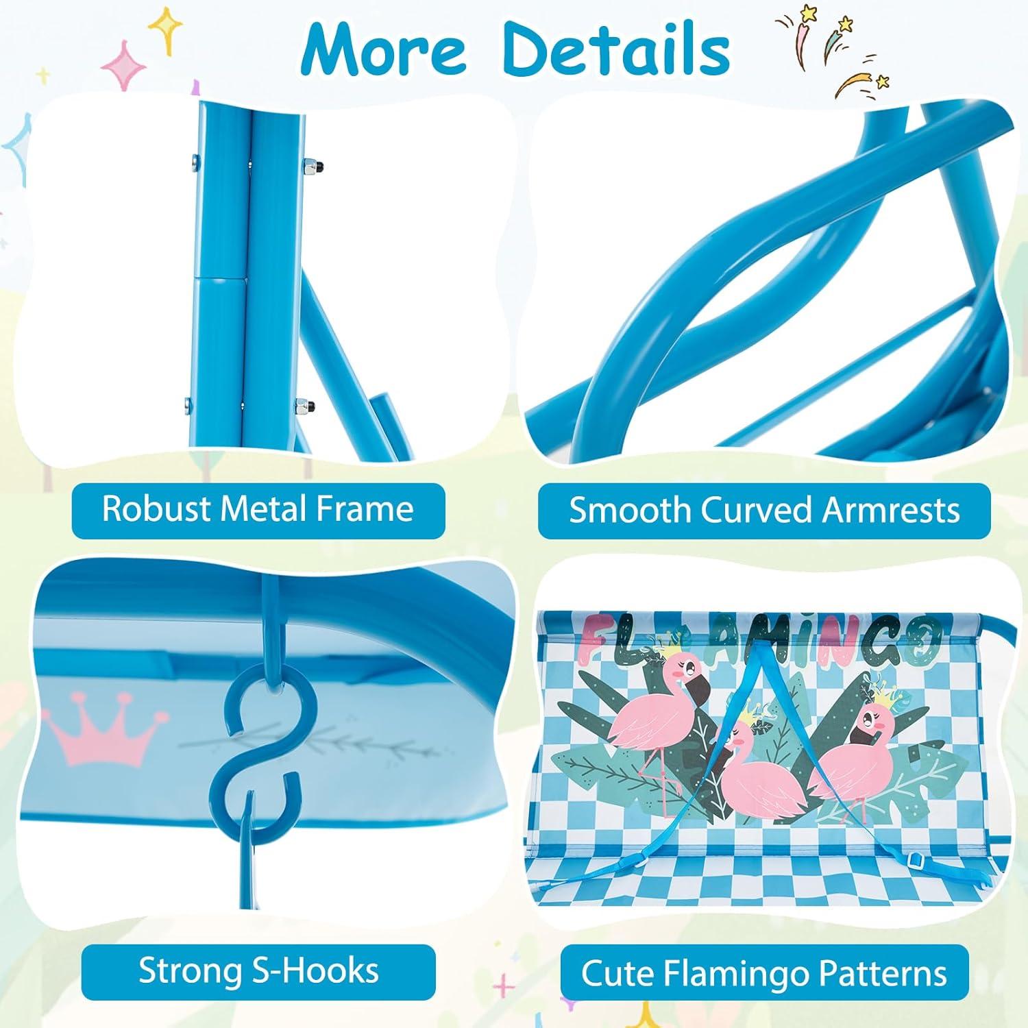 Kids Porch Swing, 2-Seater Outdoor Lounge Chair with Adjustable Canopy & Safety Belts, Metal Stand Hanging Swing Bench, Patio Swing for Backyard, Patio, Lawn, Garden (Blue Flamingo)(Blue Flamingo)
