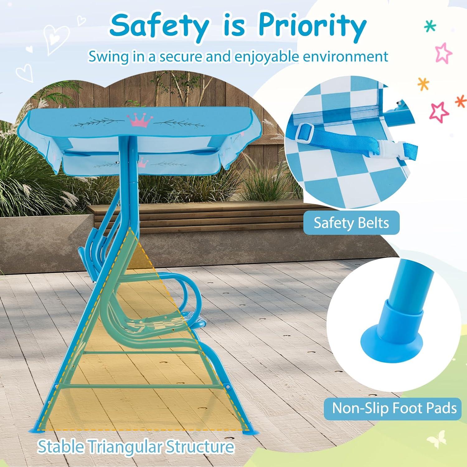 imageKids Porch Swing 2Seater Outdoor Lounge Chair with Adjustable Canopy ampamp Safety Belts Metal Stand Hanging Swing Bench Patio Swing for Backyard Patio Lawn Garden Blue FlamingoBlue Flamingo