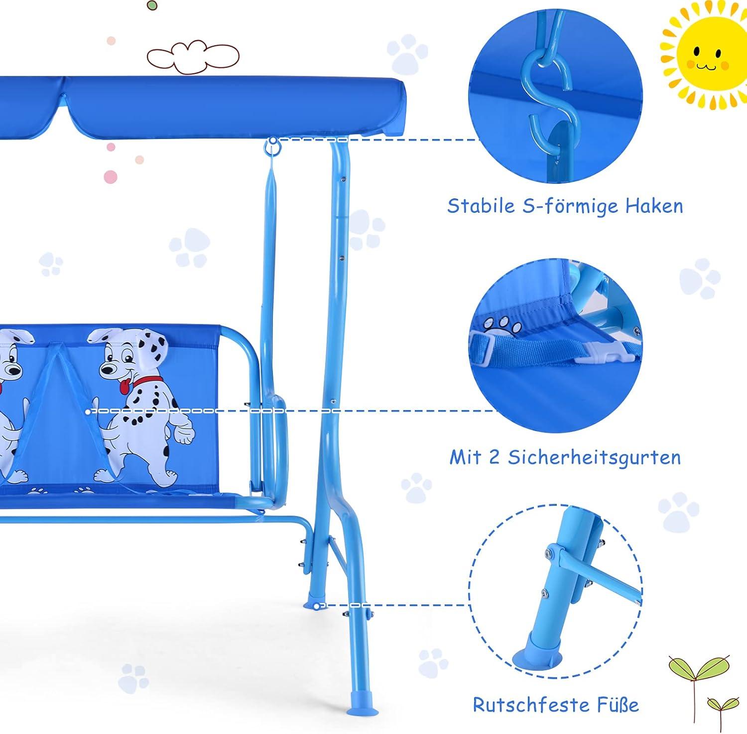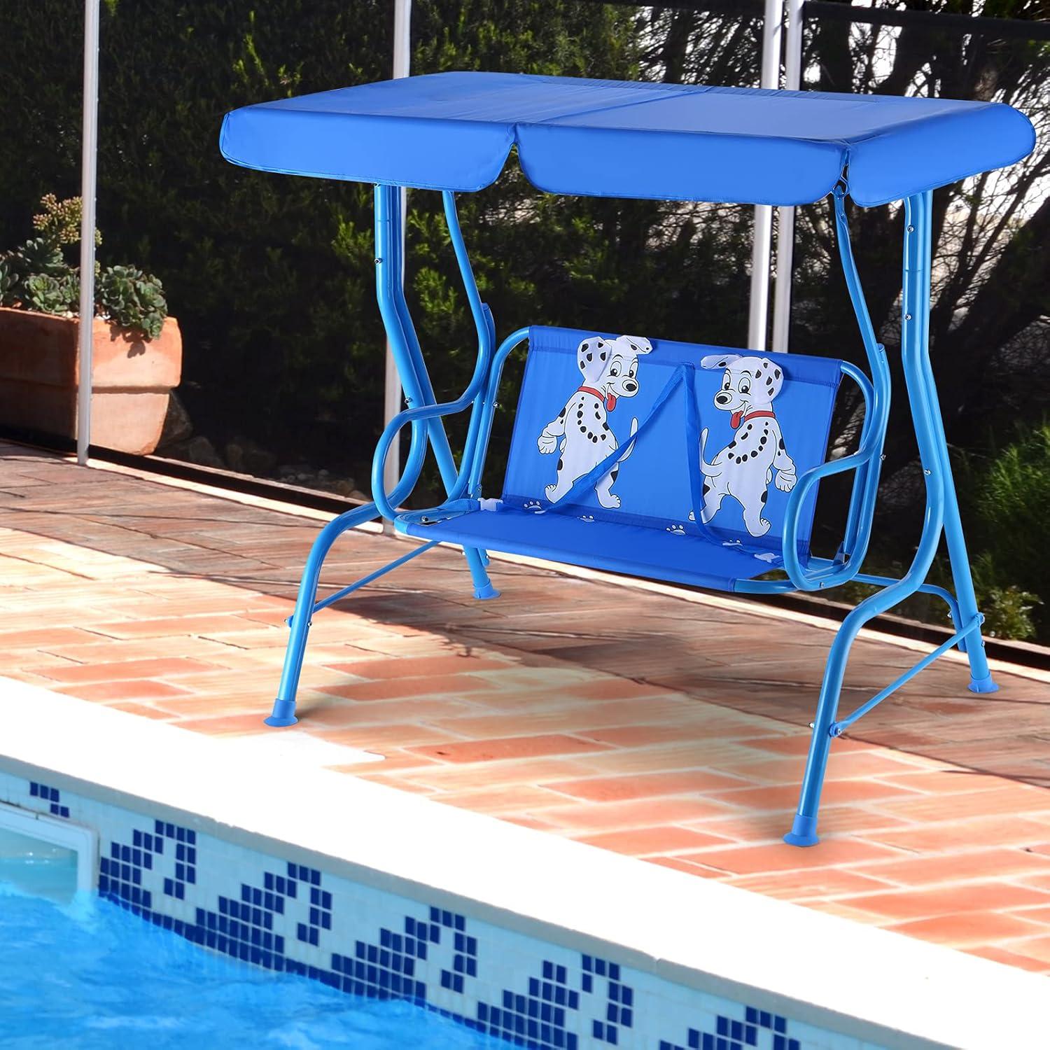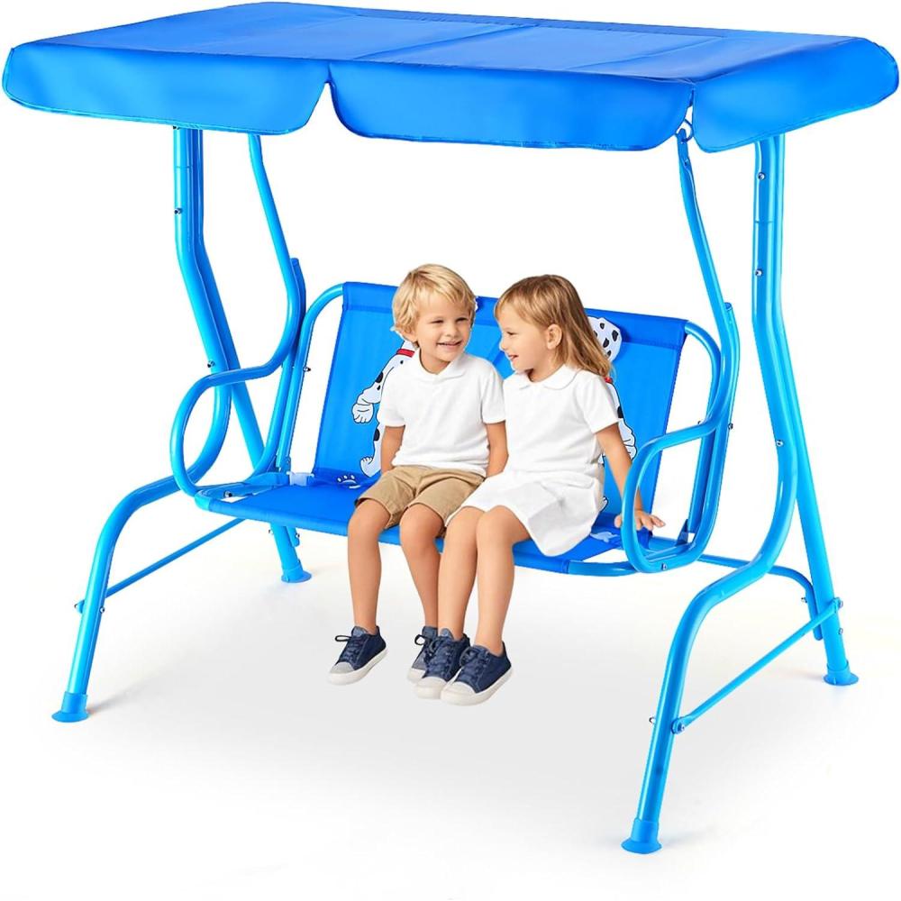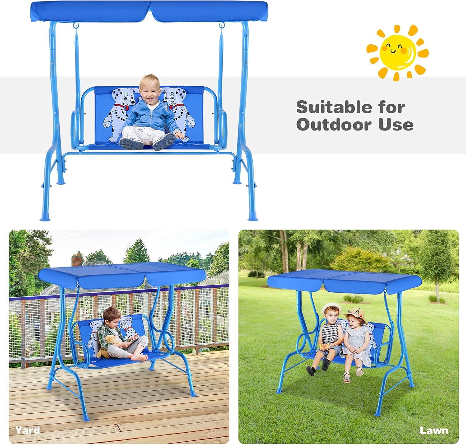 Kids Porch Swing, 2-Seater Outdoor Lounge Chair with Adjustable Canopy & Safety Belts, Metal Stand Hanging Swing Bench, Patio Swing for Backyard, Patio, Lawn, Garden (Blue Flamingo)(Blue Puppy)