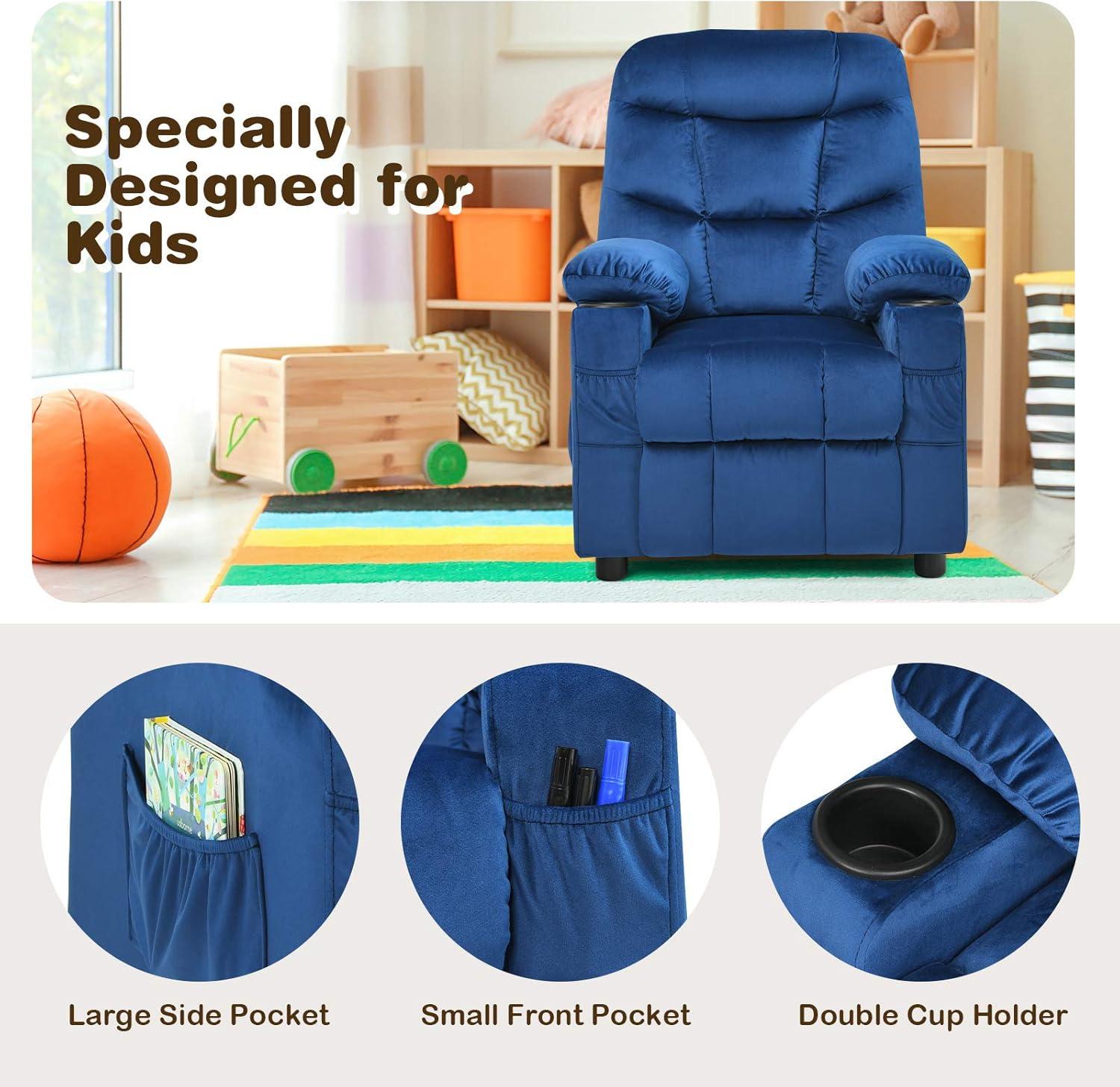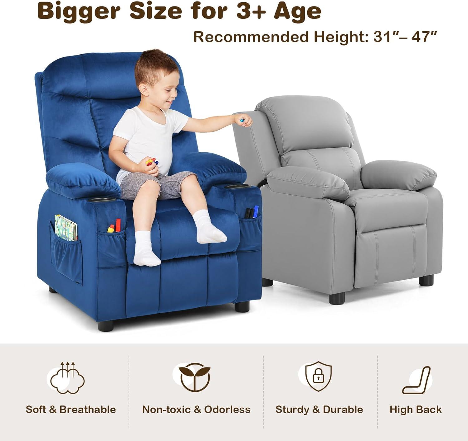 Kids Recliner, Kids Recliner Chair w/ 2 Cup Holders, PU Leather Chairs Comfy w/Adjustable Backrest & 3 Pockets, Toddler Furniture Sofa for Boys Girls Aged 3+(Deep Blue)