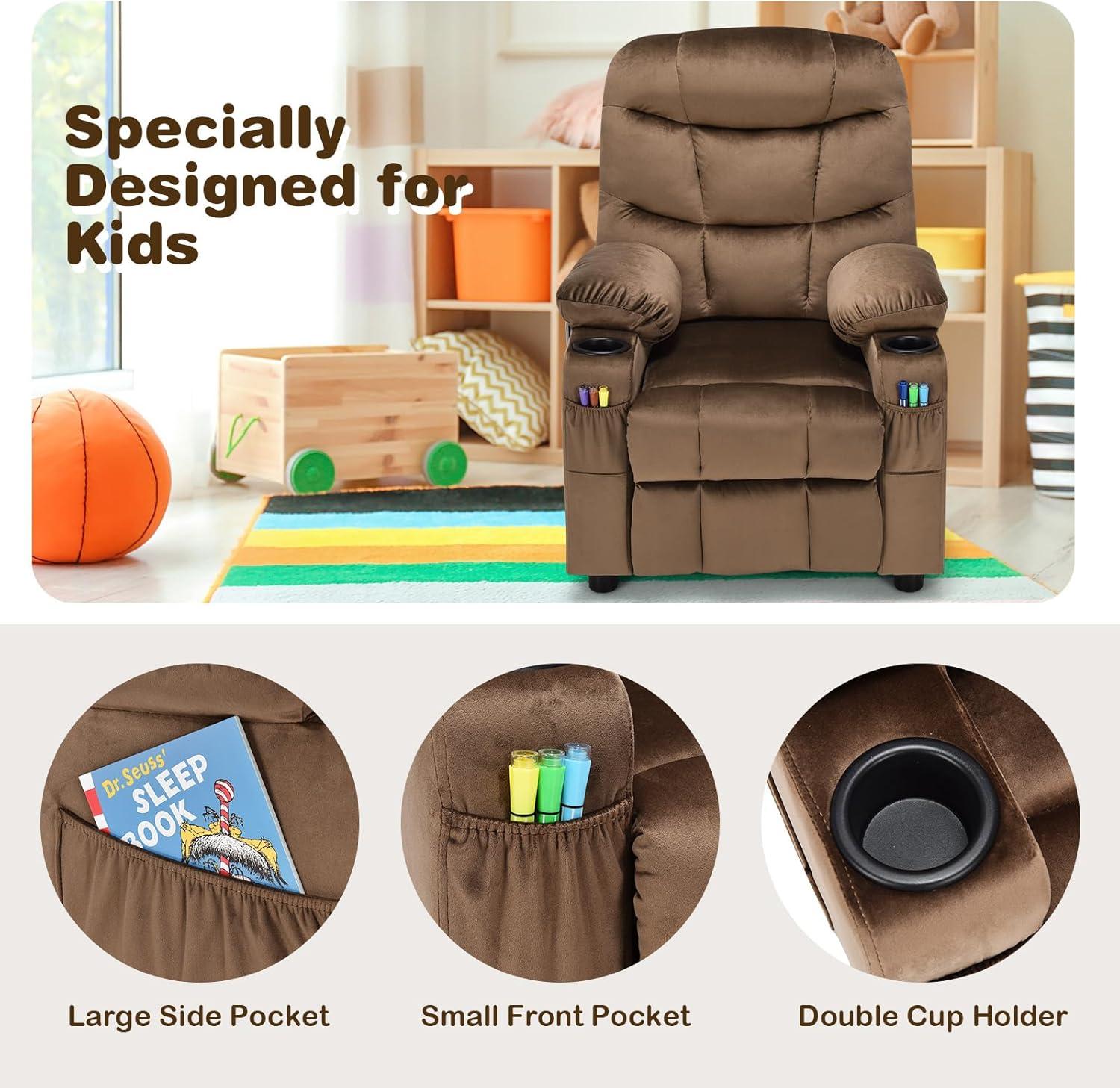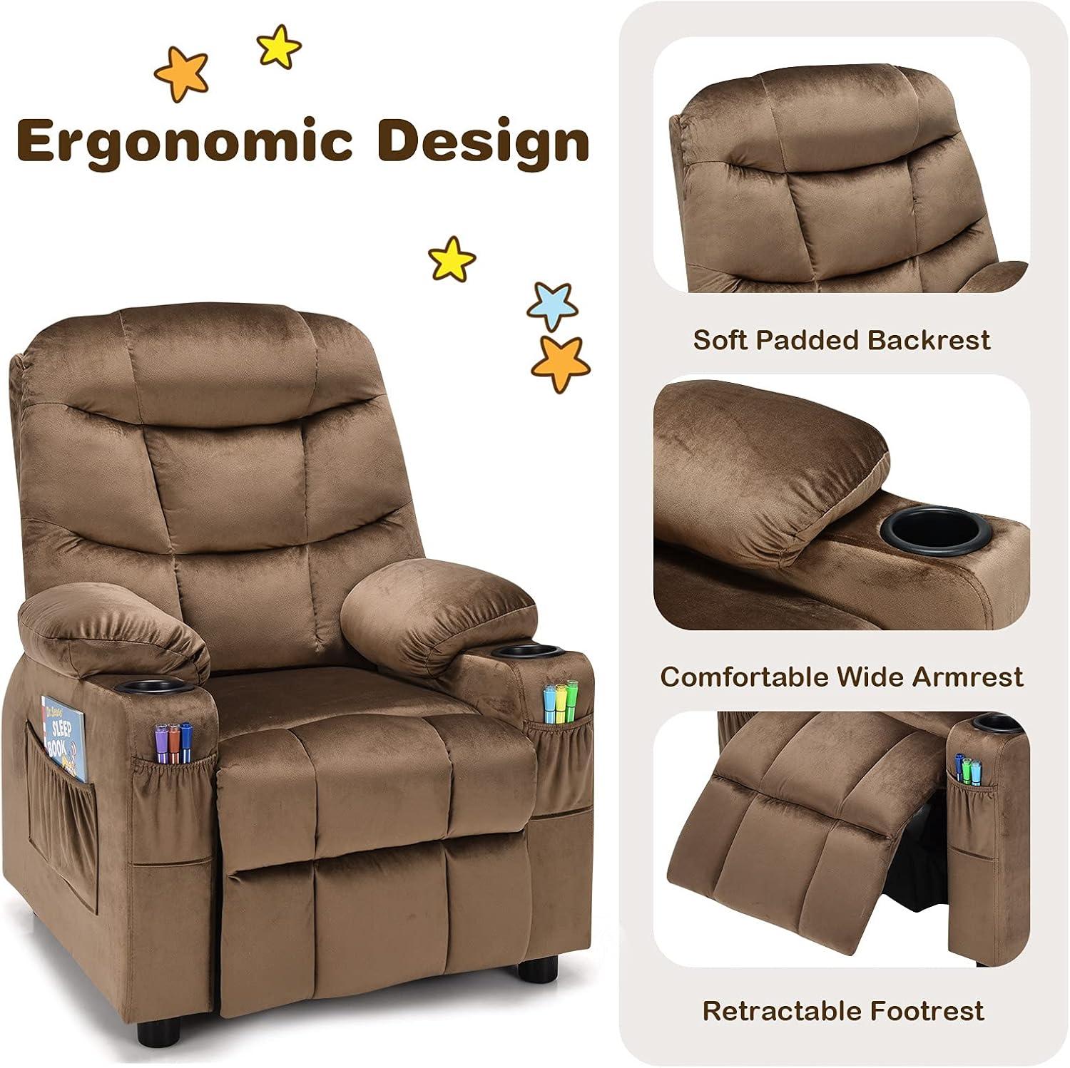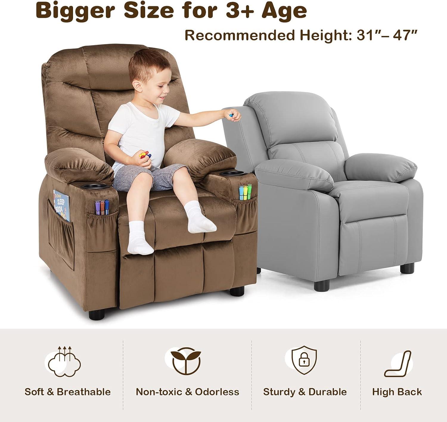 Thoughtful Design: The teens recliner with approx. 3” diameter cup holders on both sides of the armrests. Side and front storage pockets are designed to place the child's daily necessities and cultivate the child's storage habit.